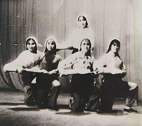 七五年钢厂八一晚会后李素珍等人舞蹈合影 左起:李素珍(广播员),鞍山青年,任玉珍(打字员,哈知青),?,后排:蒋霞君(上海知青,钢厂政治部图书员)