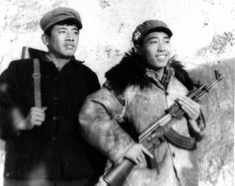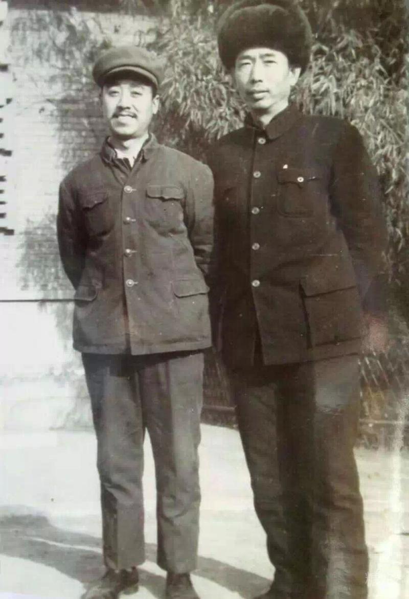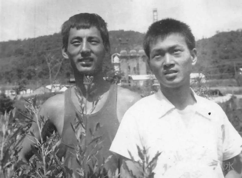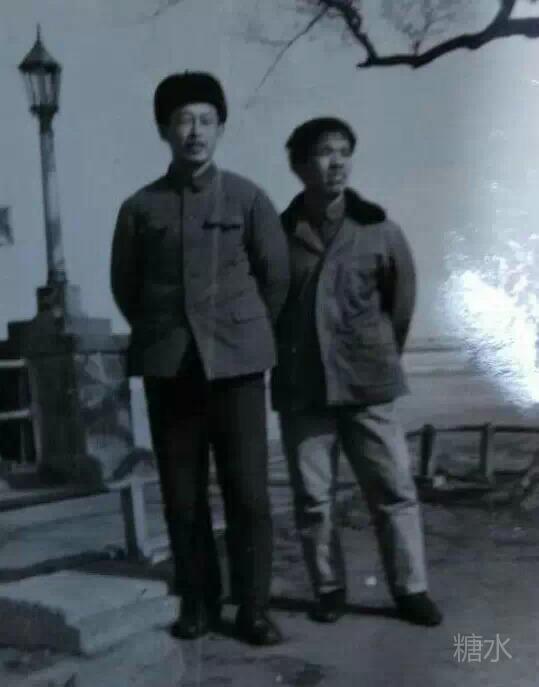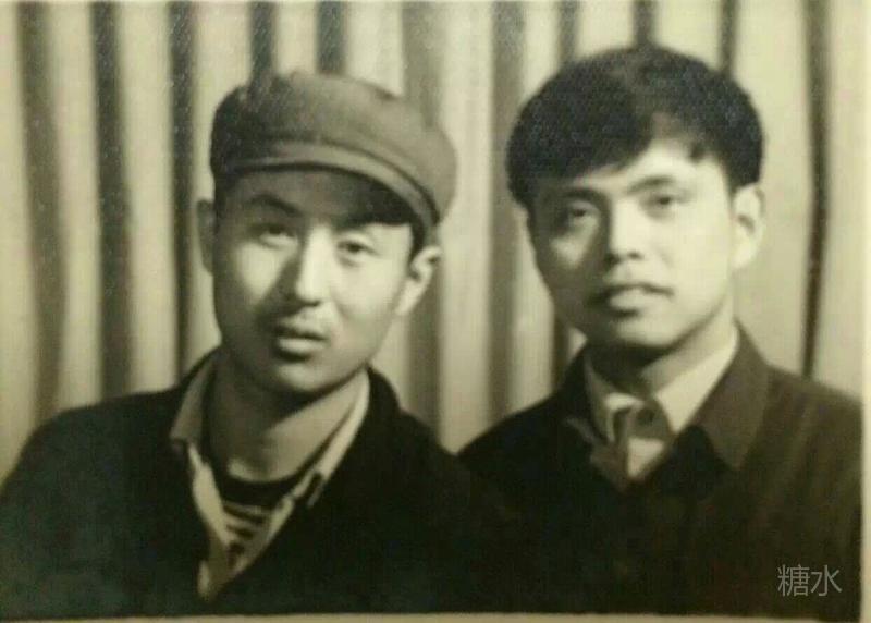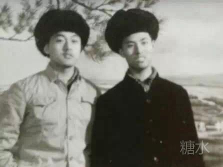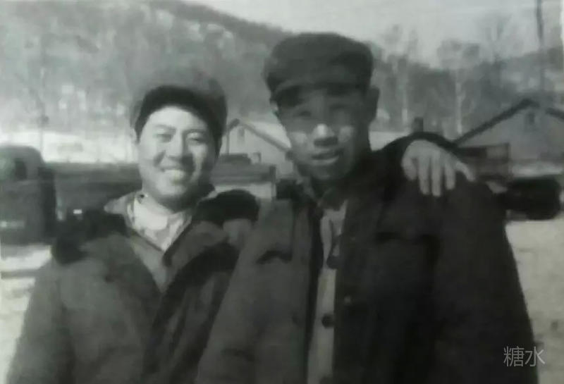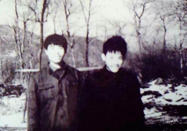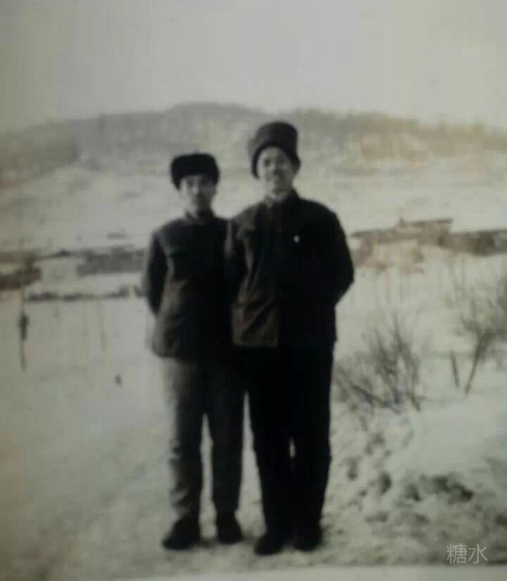 1971年冬,哈尔滨知青马起盛(左)和曹革成(制材连火锯班)在在东方红鎮转运木材期间合影。