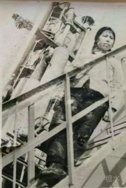 1970初冬,北京知青丁桂茹(炼铁连,时为仪表工)在高炉的热风炉上。