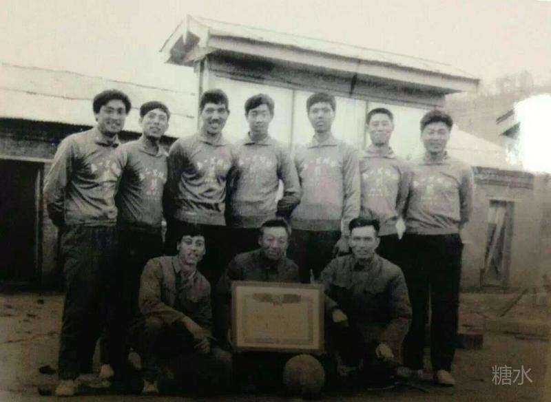 后左I周玉路:唐映福i毛兴冲:齐国臣i任万生:修路:毛玉玺:前左李开锋:程广多i刘世玉连长。 这是七九年知青返城以后i汽车连本地青年在钢厂拿的第一个兰球第一名