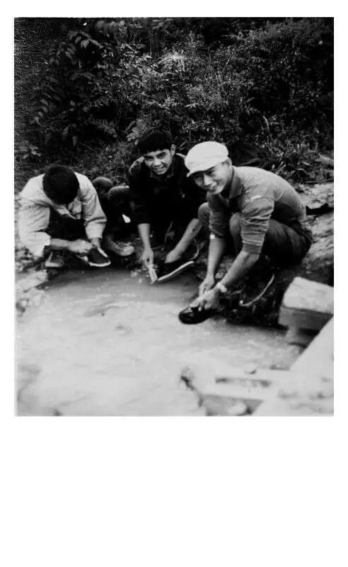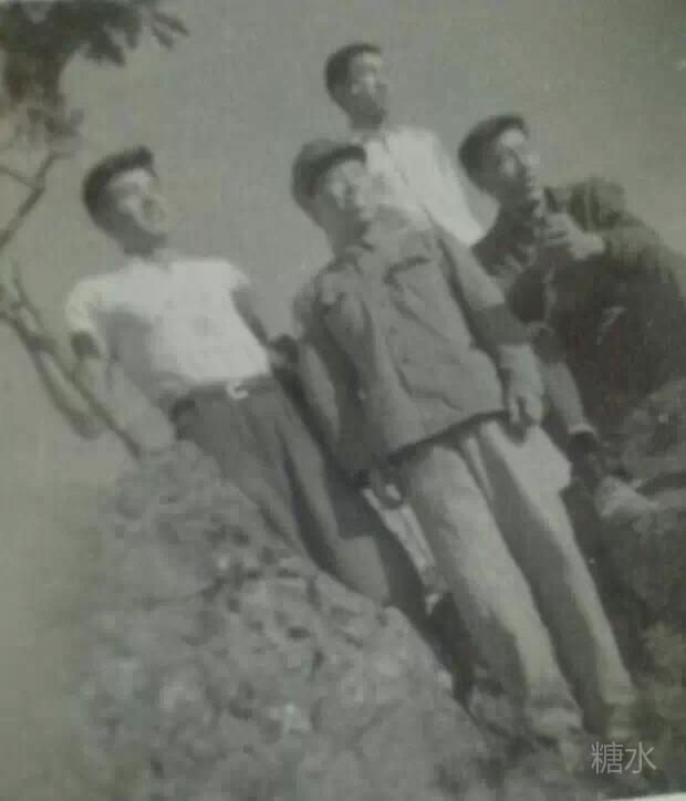 左起:?????杨静(政治部),穿白背心是王青山(本地人,钢厂第一批警卫员,18团调入任采矿二连指导员,后调商店任主任),左二戴帽子的是张岩,哈尔滨青年,机关食堂的。