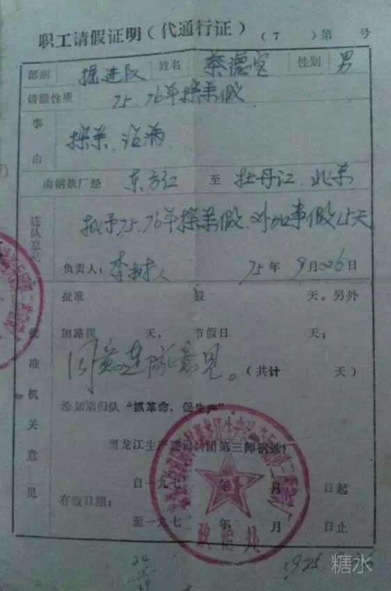 保留至今的钢厂知青回京通行证。 钢厂政治处核准掘进队蔡德宝1975年提交的享受探亲假的证明,这属于稀有历史纪念品了。 蔡德宝,北京知青、初在凿岩班、后任采矿一连副连长。