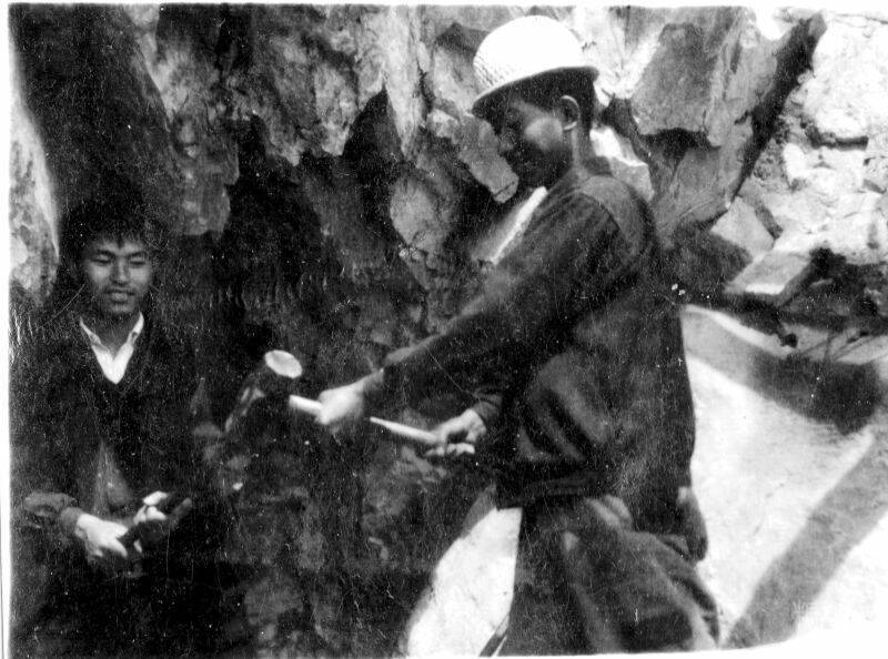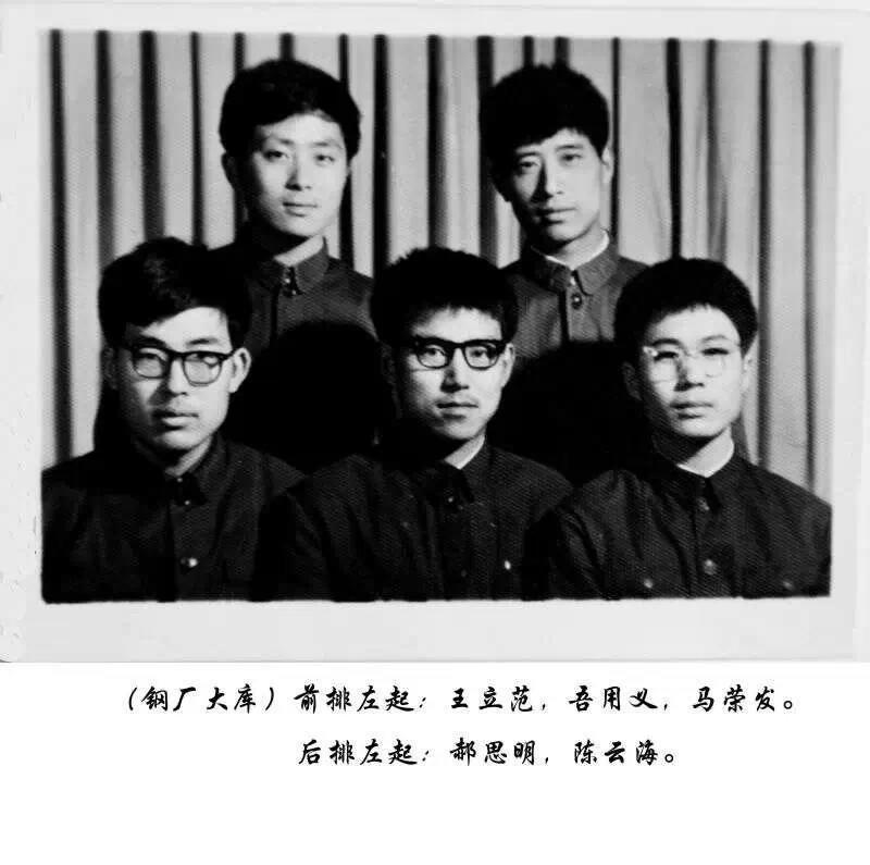 这是采矿一连当年印学习资料的老照片。人物如下:左一刘德全(当地青年),蔡晋强〈北京青年),王温茹〈天津青年),张家善〈北京青年),马惠玲(钢厂学校分配毕业生)。