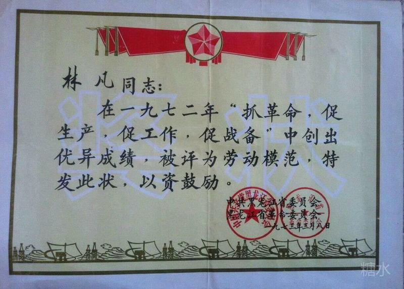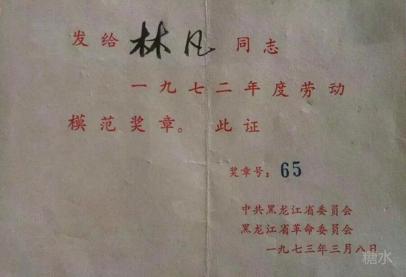 以上六张照片是采矿一连连长林凡在1972年3月荣获黑龙江省劳动模范的奖章和证书照片。
