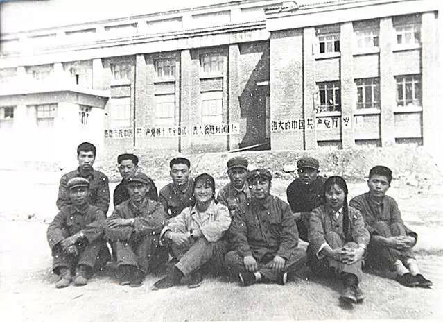 在钢厂礼堂前合影: 前排左起:杨启才(政治部组织股长),唐敦楷(政治部干事),金亚萍(政治部干事,上海知青),林崇山(政治部主任),李素珍(广播员) 后排左起:李占英(北京知青,政治部),徐文章(俱乐部放映员),孙玉泉(放映员。回29团后病故),赵干事(保卫科),李彦才(会18团消防队,其爱人是银行会计),陈玉友(政治部组织科干事)