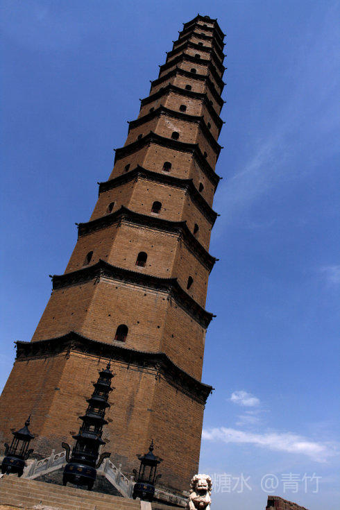 汾阳古称汾州,当地有句俗语“看不见碱场塔,哭得恓惶煞”。这个碱场塔就是汾阳的文峰塔。因塔建于今汾阳的建昌村,所以也俗称“建昌塔”。建昌村从前叫碱场村,因地势低洼、水碱过重而得名。 汾阳的文峰塔以高出名,号称“天下第一塔”。到汾阳去游览文峰塔,附近的老人就会给你念叨:“汾阳有座碱场塔,距天只有二尺八”。汾阳文峰塔现在的准确高度是84.97米(维修前残高度80.12米),其高度在全国砖塔中确实名列前茅,也是我国现存文峰塔中的杰出代表。2006年5月25日,汾阳文峰塔被国务院批准列入第六批全国重点文物保护单位名单。