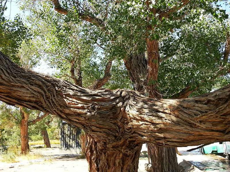 胡杨树型与一般杨树大不一样,树干粗壮而多分支,树叶有柳叶型和椭圆型两种,树冠宽圆,成年的胡杨给人以苍劲挺拔的感觉。