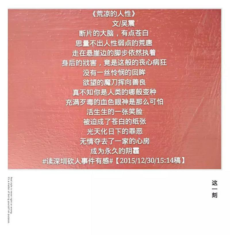 《荒凉的人性》 文/吴震 断片的大脑,有点苍白 思量不出人性弱点的荒唐 走在悬崖边的脚步依然执着 身后的戕害,竟是这般的丧心病狂 没有一丝怜悯的回眸 欲望的魔刀挥向善良 真不知你是人类的哪般变种 充满歹毒的血色眼神是那么可怕 活生生的一张笑脸 被迫成了苍白的纸张 光天化日下的罪恶 无情夺去了一家的心房 成为永久的阴霾 #读深圳砍人事件有感#【2015/12/30/15:14稿】