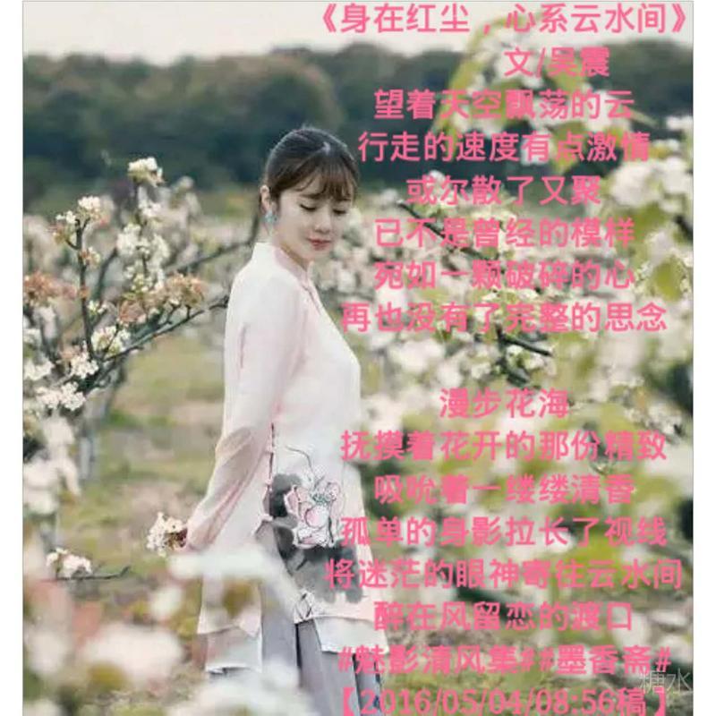 《陌上花,相思扣》 文/吴震 唤不醒曾经的梦 在遇见的那一刻就已知晓 落下的雨滴不大不小 淋湿了思绪里执着 尘埃在溅起的刹那 你的微笑镌刻了一幅画 虽然没有色彩的艳丽 那份清新的黑白 痴迷了眼神里的一切 一步一步走近三生石前 默念着前世今生的流连 在有风的季节 带去万语千言 让不醒的梦继续缠绵 恍惚中牵着手漫步云水间 诉说春秋里的缱绻 此时陌上花已开 正浓的艳 和着唐风宋词浅唱 不折不扣地留恋 #魅影清风集##墨香斋#【2016/06/30/19:14稿】