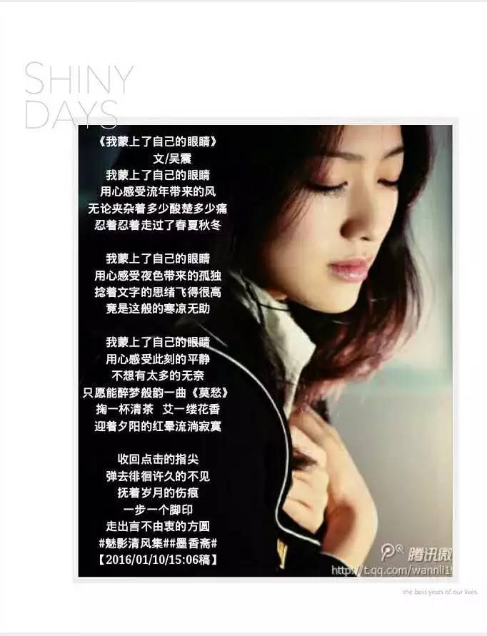 《我蒙上了自己的眼睛》 文/吴震 我蒙上了自己的眼睛 用心感受流年带来的风 无论夹杂着多少酸楚多少痛 忍着忍着走过了春夏秋冬 我蒙上了自己的眼睛 用心感受夜色带来的孤独 捻着文字的思绪飞得很高 竟是这般的寒凉无助 我蒙上了自己的眼睛 用心感受此刻的平静 不想有太多的无奈 只愿能醉梦般韵一曲《莫愁》 掬一杯清茶 艾一缕花香 迎着夕阳的红晕流淌寂寞 收回点击的指尖 弹去徘徊许久的不见 抚着岁月的伤痕 一步一个脚印 走出言不由衷的方圆 #魅影清风集##墨香斋#【2016/01/10/15:06稿】