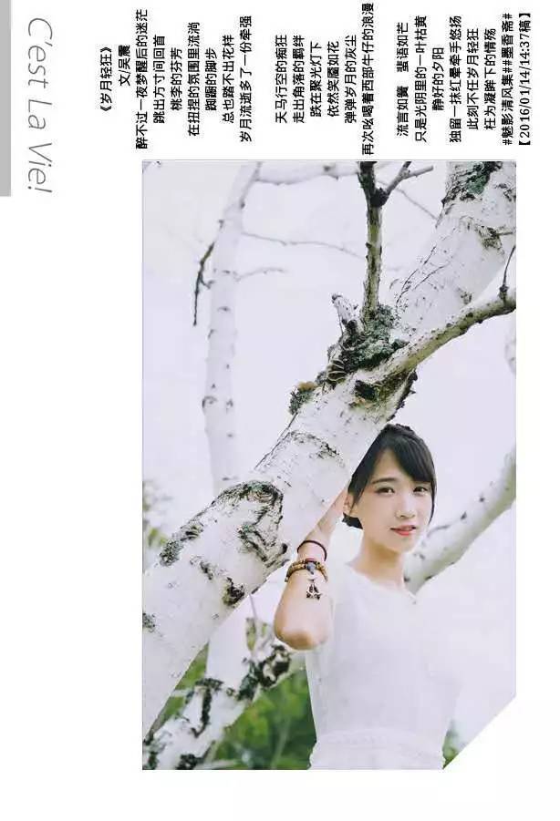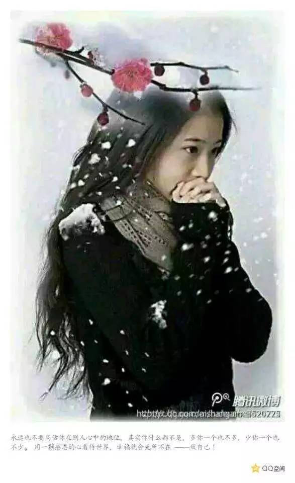 《一个人的时候》 文/吴震 走在落满白雪的林间小道 感觉一丝寒冷袭来 搓着双手呵着暖气 将四周打探 寂静林间没有一声鸣叫 听到的也只是自己行走的压雪声 咯吱咯吱咯吱。。。 出奇的宁静 也没有带来一丝微风 只是那般的空灵 心想着难得的独处 竟是如此简单 一个人的时候 思绪任凭天马行空的遨游 心情也能这般的释放 立于地 与天遥相呼应 醉的眼神 拉近了春语的梦境 走在自己的空间呼吸 是那么的舒畅 没有世俗的叨扰 没有锱铢计较的嘈杂 没有欺瞒的虚伪 一个人的时候 真好。。。 #魅影清风集##题图漫话#【2016/01/04/09:07稿】
