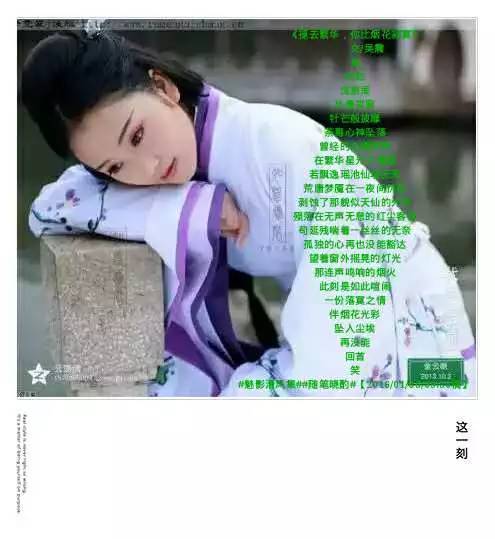 《愿我弦上三千浮华,换你一世薄凉》 文/吴震 尘烟尽处散了一缕愁 淡淡的芳香 浓了山水间的春色 抚着弦上音律 指尖的繁华 韵在远方 匆匆过客的神话 在回眸的那一刻 当了真 回味时长久久留恋在心间 一曲曲念的浅唱 随着风走的方向飘荡 却是如此茫然 戏水三千竟是荒唐 殁了浮华一世凄凉 一叶枯黄 凋零过往的殇 默默孤单在季节的港湾 #魅影清风集##墨香斋#【2016/08/05/08:30稿】