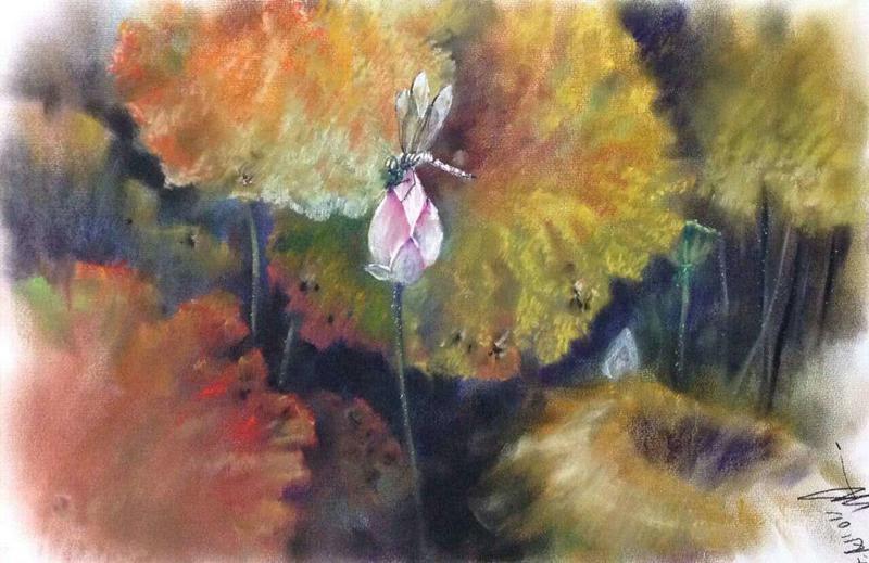 火火编按:和上次的《桥》一样,读高兴博士的《荷花》,又产生与众不同的感受。我想各位微诗大家们也是一样的感觉,所以才欣然名笔,互相唱和。高兴的荷花,色彩鲜亮,首先给您强烈的视觉震撼。画面主题描写细腻,或叶、或花、或苞,特别是蜻蜓,把翅膀、眼神、脚等勾画得栩栩如生、活灵活现——作者善于捕捉蜻蜓不同的姿态、不同表情来表达不同内涵。而背景,则用虚幻的笔调,使得画面扩张、外延扩张,留给作者无限的想象空间,回味无穷。期盼高兴老师更多的好作品,也期盼诗友们更多的佳作。