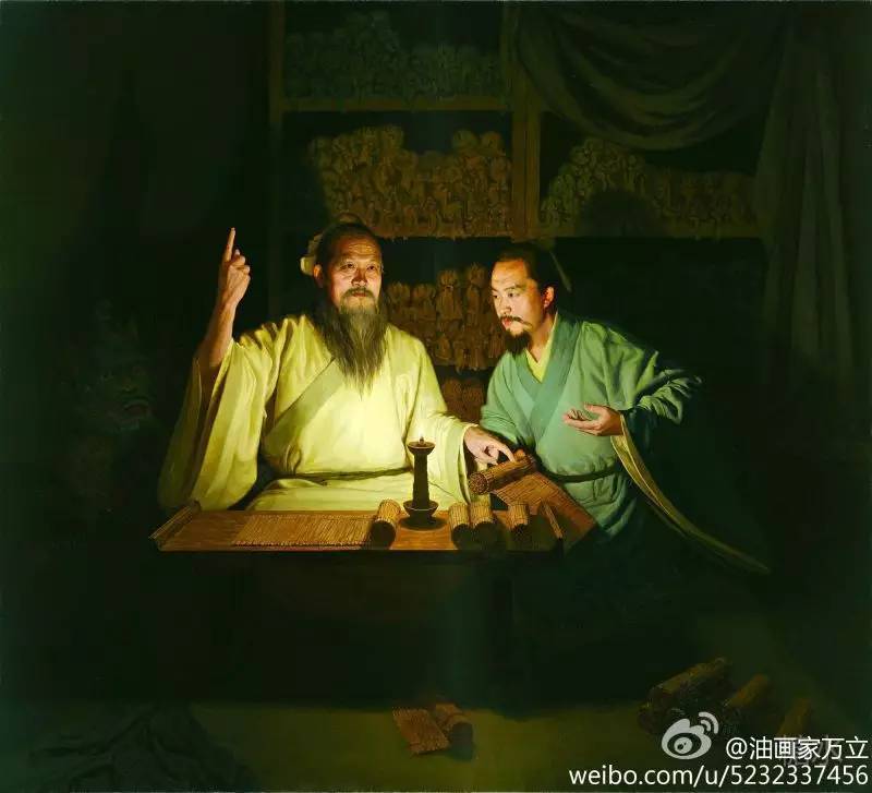 《孔子传孝》(布面油画 160cmX134cm 2015年7月)/ 万立 《史记.仲尼弟子列传》:孔子以曾子能通孝道,故授之业,作《孝经》。十三经注疏.公羊传, 子曰:春秋嘱商(子夏),孝经嘱参(曾子)。都有孔子传授孝经给曾参的明确记载。在论语颜渊 篇章里齐景公问政于孔子。孔子对曰:君君,臣臣,父父,子子。君义臣行,父慈子孝,兄爱弟敬, 从中看出,老夫子理解的孝是二元的,是双方共同生成的,不是单方面的绝对服从。这于后世的意 义重大。油画《孔子传孝》画面里孔子神态慈祥和睦,正在向曾子传授着《孝经》,弟子曾子性情 敦厚,虔诚地聆听着夫子的教诲。 画面选取的是在室内的环境中,一束天光从左上方打下来,整个 画面衬托着主体人物,光依次撒在孔子的头像、肩,左手指尖和紧握着竹简的右手,胳膊自然地搁 在右膝盖上,右胳膊的处理犹如一个方盒子,胳膊大面积暗面既衬托了受光面的小臂,同时也体现 了腿部的支撑力度;光随着长袍在地面展开。曾子颈间的水衣和左袖口处漏出的白色与孔子衣袍颜 色相呼应。曾子的右手隐没在了竹简下方的影子里,腿上重重的大面积投影加强了腿部与竹简之间 的空间感;观众仿佛可以直接从曾子手中接过竹简一样,也增强了整个身躯的空间感。人物身后与 凳子之间的部分影子拉开了人与凳子之间的距离,也让背景增加了层次,让光逐渐往后延伸,再隐 没到墙角。书柜的立面和光源形成了方圆的对比。 人物身后的背景墙的冷色调处理,拉开了与前景 的空间,前景阴影的处理仿佛让观众置身于影子里。 《踏歌词.孔子传孝》/爱玲 君义臣行也,纲常不可抛。家和须有序, 子孝父慈标。曾子厚德操,夫子促膝教。