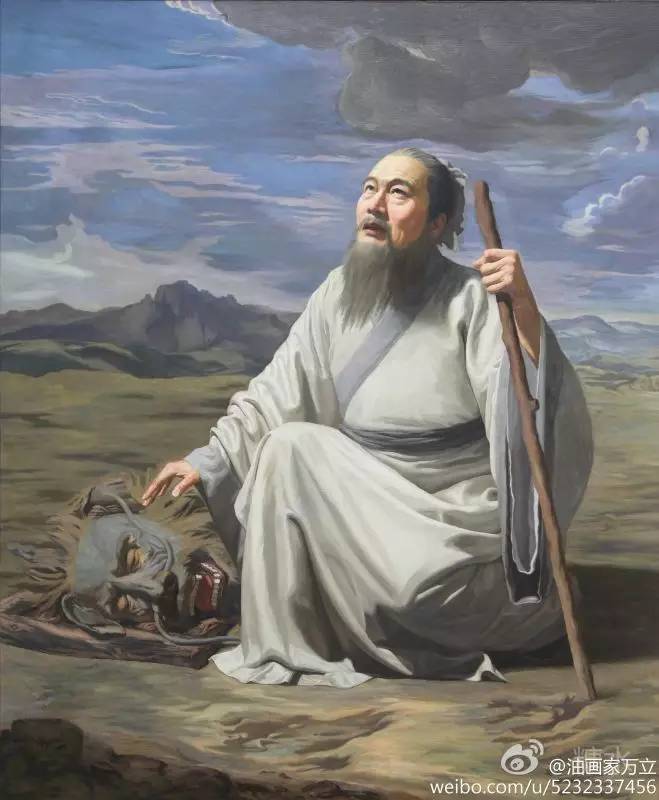 《圣道——孔子与颜回》(布面油画 160cmX134cm 2013年12月)/ 万立 春秋末年,孔子与弟子们在周游列国时,途经陈国和蔡国之间被困,史书记载,此时无上 下之交,就是说,这时与外界失去了联系。史称“陈蔡之厄”或“陈蔡絶粮”。通过这次经历,孔子 想到要写《春秋》一书。 被困在陈国和蔡国之间,粮食吃完了,孔子与弟子们都饿了七天,弟 子们有的饿得躺在地上都动不了,站不起来了。《史记》上说,从者病,莫能兴。面对如此困 境, 性命攸关的时刻,孔子处之泰然,仍旧论道讲学,教化弟子,弦歌不止,这是何等崇高的 精神境界。孔子依次召弟子子路、子贡、顏回入見问询。只有顏回的对答让孔子最感欣慰。孔 子召颜回入见,说:“不是狮子也不是老虎,在这旷野里,难道是我的‘道’不对吗?我为何会有 如此这般的遭遇。”颜回答:“老师您的道太大了,他们都容不下,不理解。即使是这样,老师 仍然践行着自己的道,不被理解又有什么关系呢,这不正体现了君子悟道的境界吗。如果没有 修道,是我们该惭愧的事。现在道已经修成而不被任用,是有国者该惭愧的事。不被理解又有 什么担心和忧虑的呢,这不正体现出了老师‘道’的高明吗!”孔子欣然而笑说:“有是哉顏之子! 使爾多財吾 爲爾宰。” 这幅油画展现的是在历经“陈蔡之厄”的艰苦时刻里,我们的孔老夫子仍然与弟子论道讲学、 弦歌不断的情景,油画再现了颜回刚刚对答完孔子的话,孔子欣然而笑的瞬间。一束强烈的光 线照在孔子和颜回的身上,孔子正侧面朝向观众,盘膝而坐,身后墙的影子衬托着孔子坚实有 力的型体,有如雕塑般结实。孔子像是刚刚弹完一曲,琴弦上散发着的余音,弥漫在整个房间 中。画面 中的光源是从左上方照在孔子的脸上,孔子目光慈祥、温而又坚毅。颜回谦恭含蓄而 且坚定地注视着夫子,表达着自己对老师‘道’的理解和坚定的信念,聆听着最喜爱的弟子颜回的 见解,让老夫 子欣慰不已,《史记》中用‘欣然而笑’来记载孔老夫子当时的神态。画面深色背景 的处理衬托出了主体人物的精神面貌,选取哲人孔子和颜回精彩对话的历史瞬间,展现我们先哲 们悟道的境界和思想的深远。 《天门谣.圣道——孔子与颜回》/爱玲 陈蔡七天困,纵粮绝、品琴高论。 神自稳,道心笃、愁甚。 与弟 子颜回师道审,答:大道渊博谁称。 夫子奋,欲教化,春秋初纭。