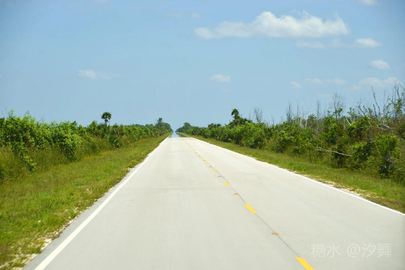 在湿地公园的马路上行驶(看前面一端路面在阳光的照射下呈现出水汽状)