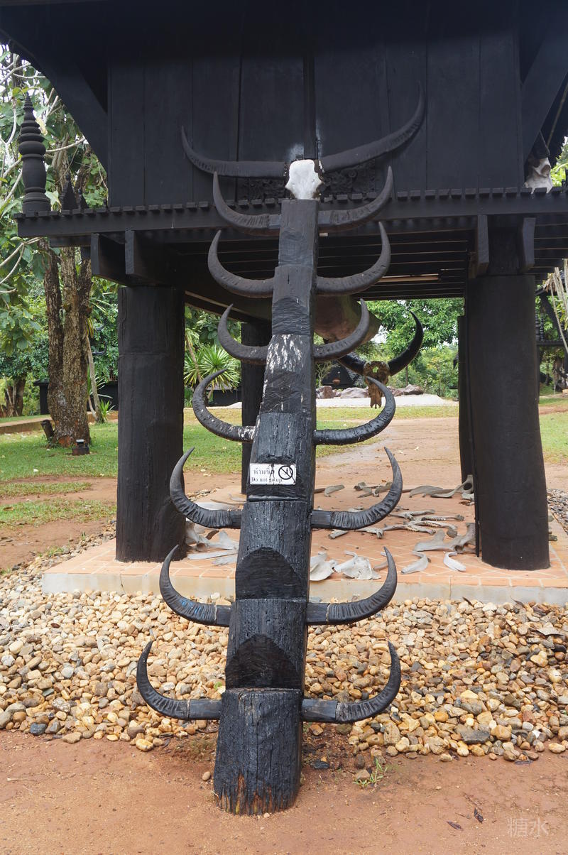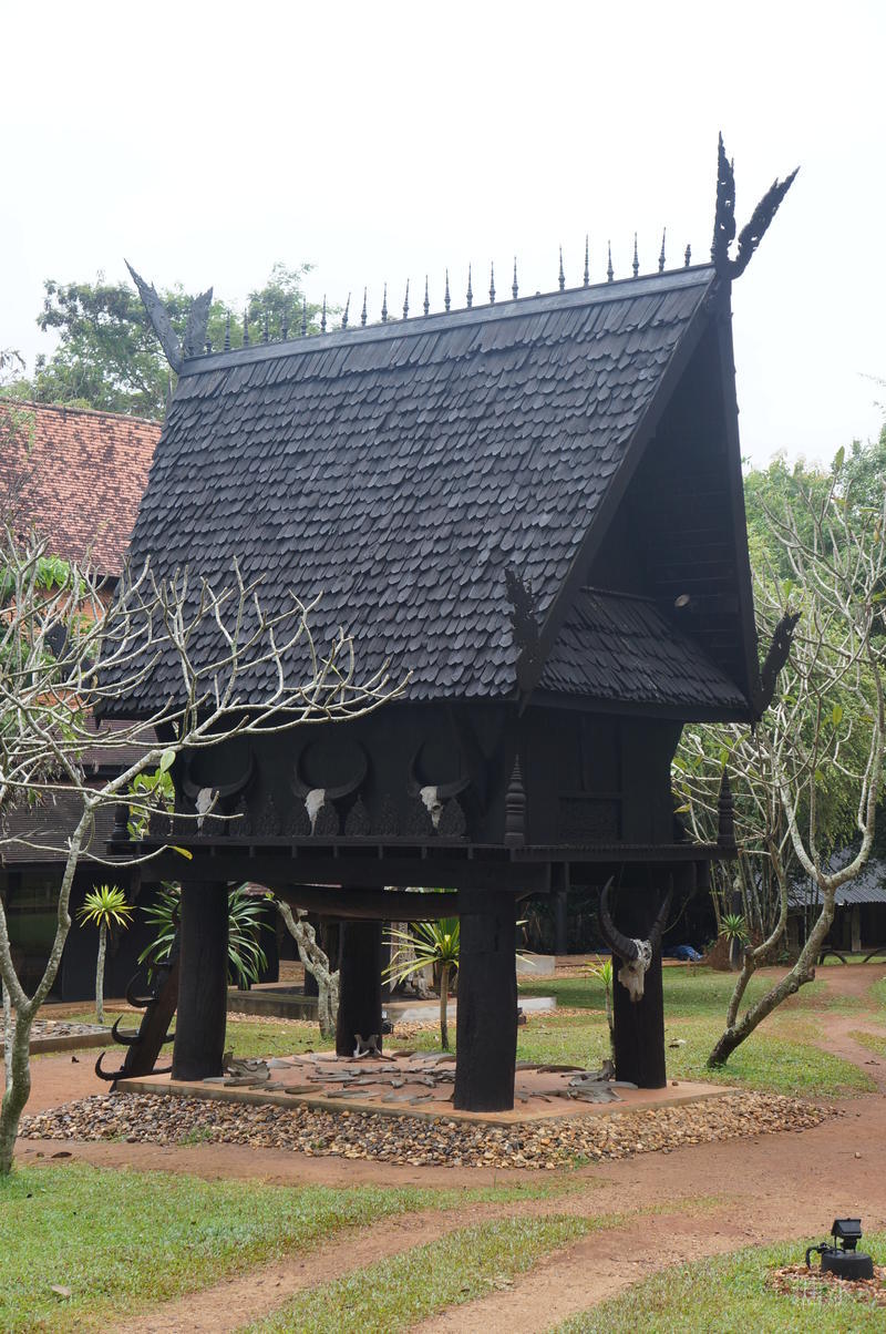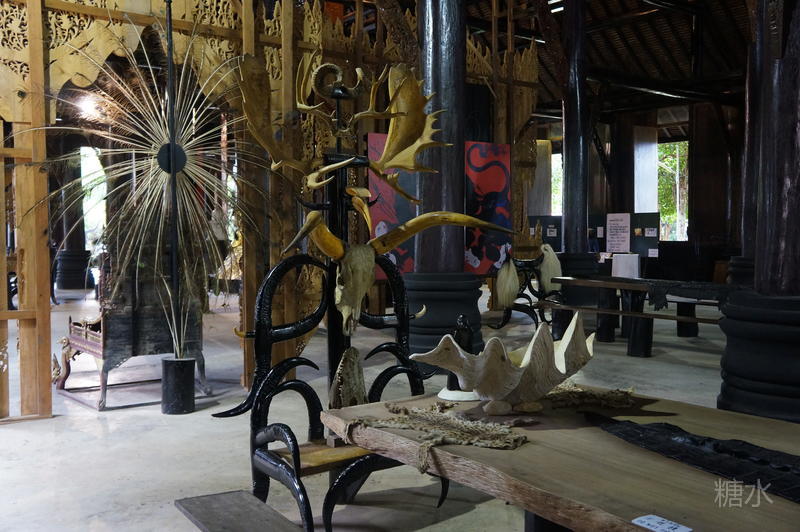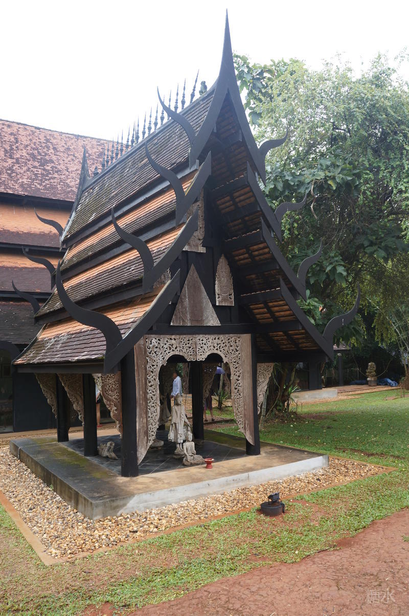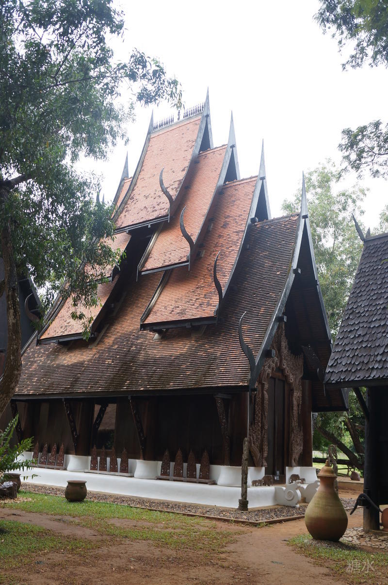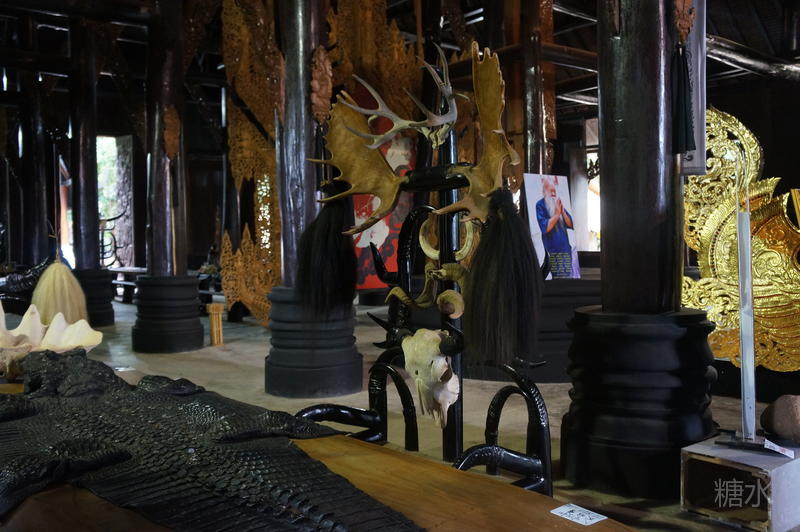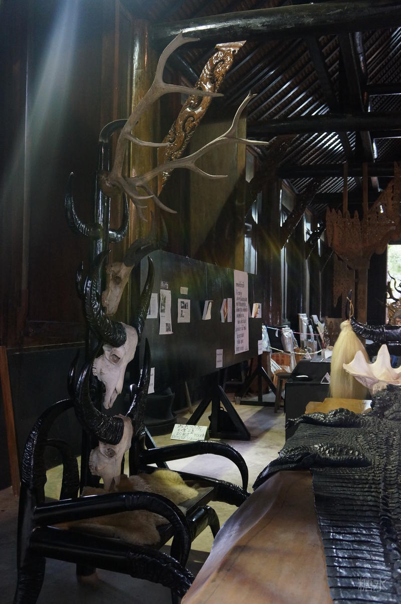 黑屋博物馆是由泰国鬼才艺术家Thawan Duchanee花费了36年时间设计并建造,黑屋博物馆的外部是由柚木建造。黑屋博物馆搜集了大量关于动物死亡的骸骨,把远古时代的兽骨,原始民族的猎杀工具,古董和标本等,用现代艺术手法融合成各种艺术品。 黑屋博物馆周围还散落着十几栋大小不一以牛角装饰的建筑,有几栋建筑甚至有三、四层楼高,因为所有的建筑、展品、艺术品等都以黑色为基调,所以又被称之为黑屋,黑屋博物馆。也俗称黑庙。 黑屋的规模比灵光寺要大。艺术价格也很高。