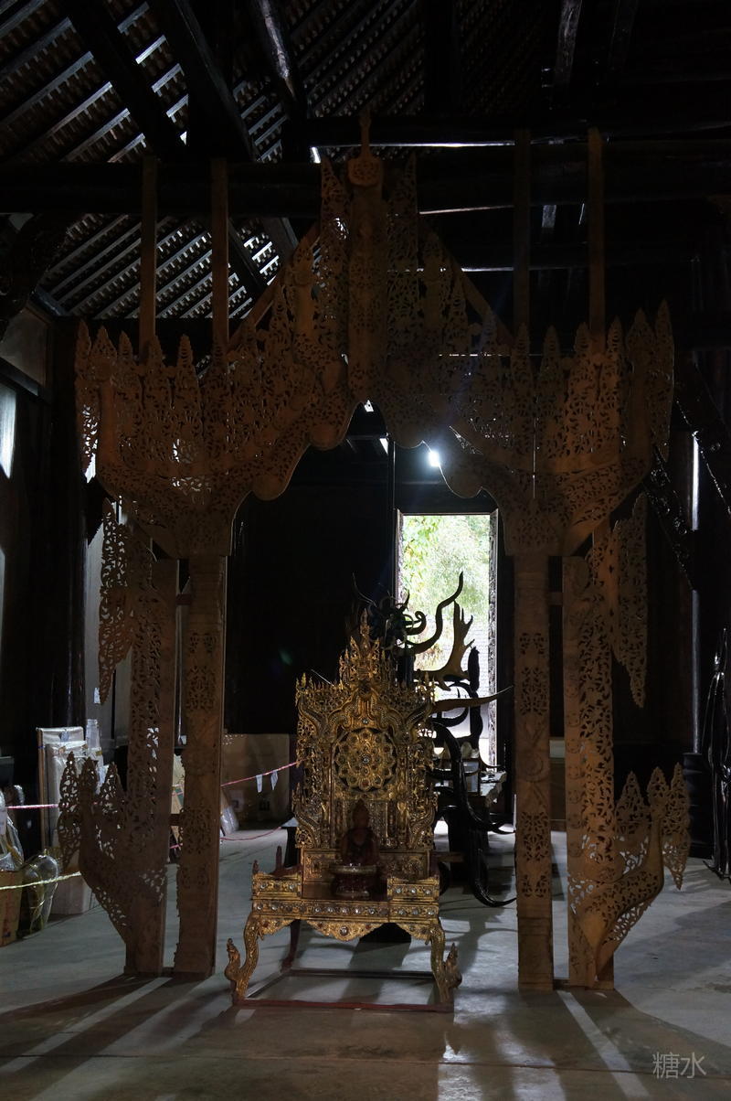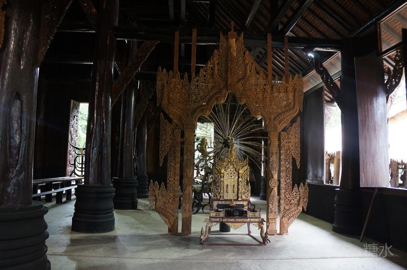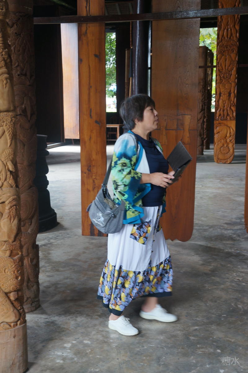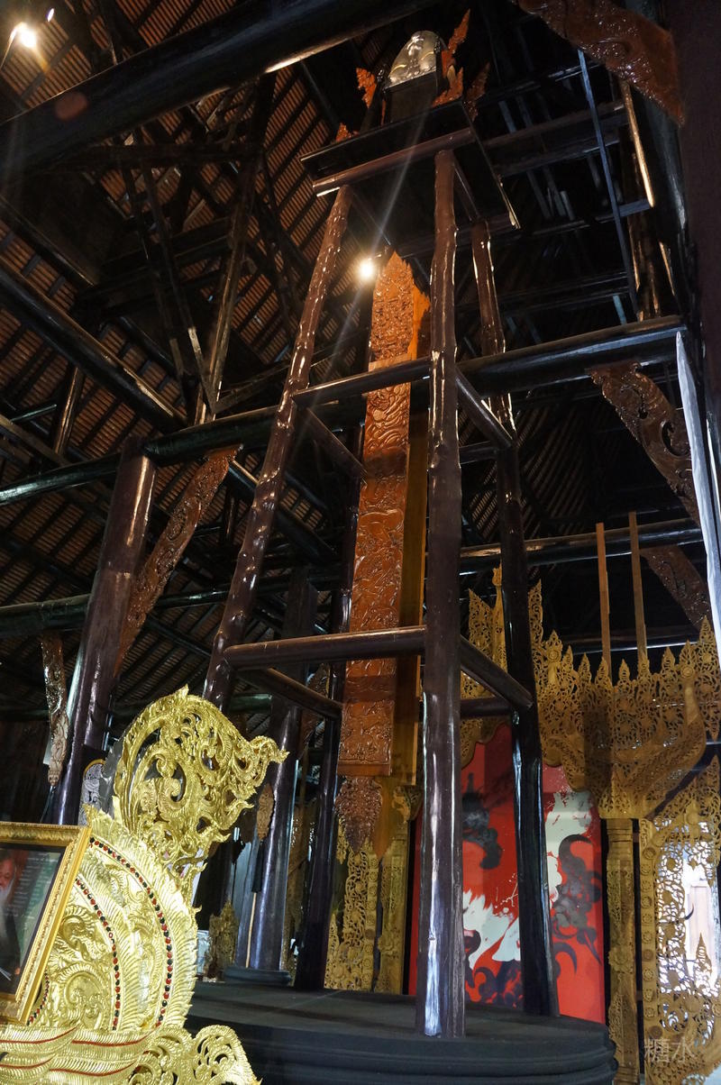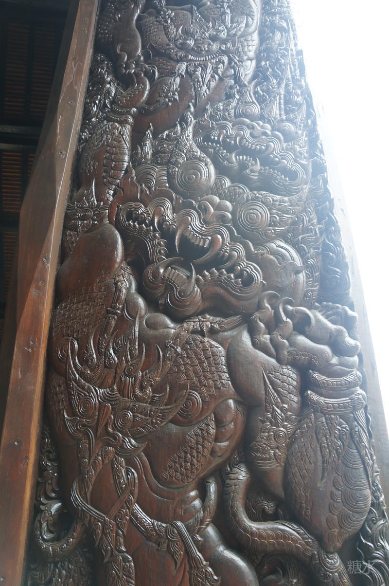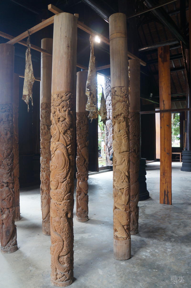 进入大殿就能看到左右两边排列着许多雕满图腾的柚木木柱。