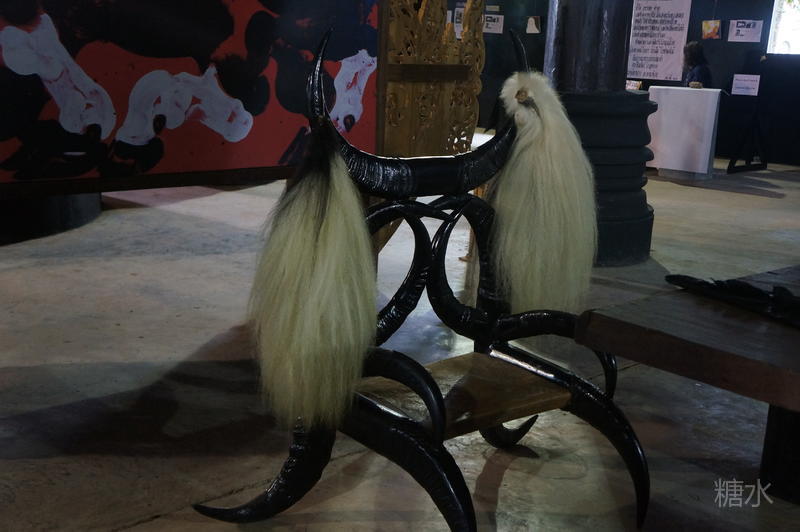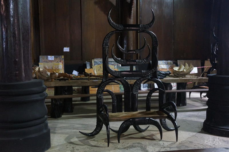 大殿中有许多牛角构成的椅子。这是一把低背的椅子。