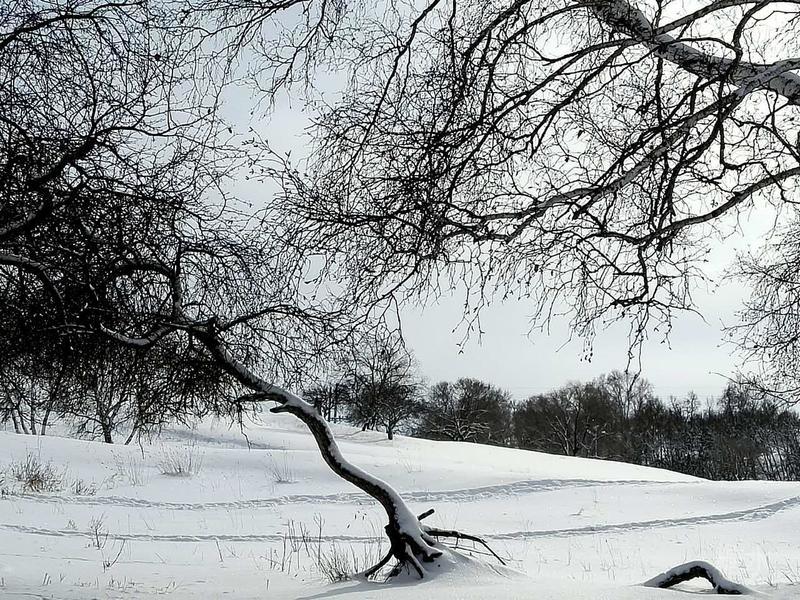 沿着没有车印的雪路一直向前,回看一路弯弯曲曲的车辙,这是我们留在军马场草原上的独行队伍的印记——摄影三人行
