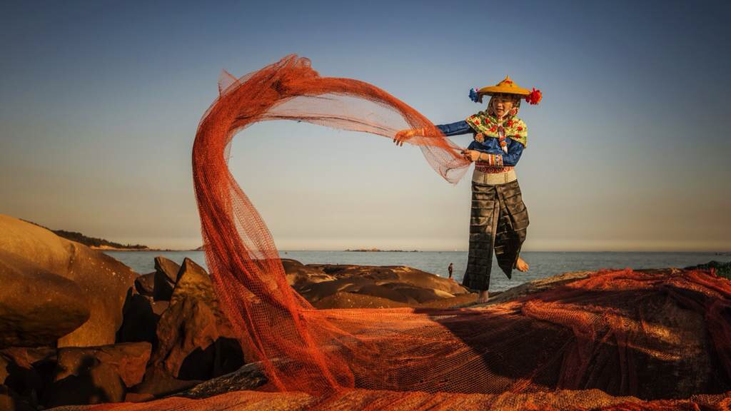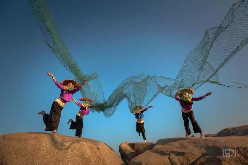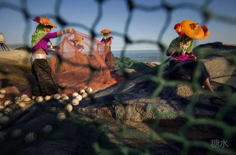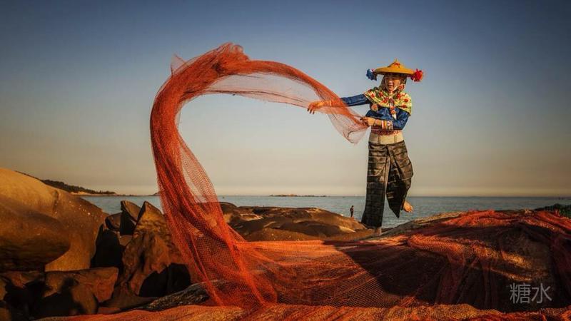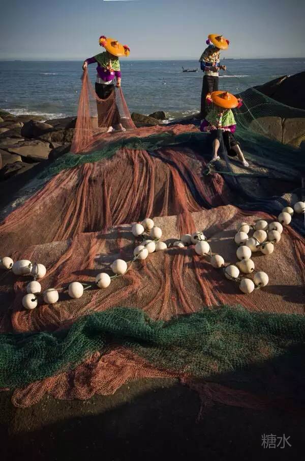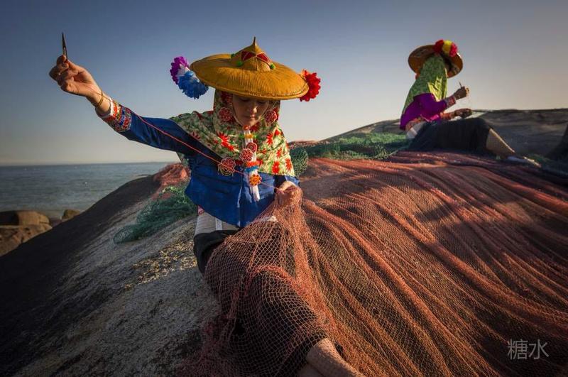 渔家女很小就会织渔网,逆光下的渔家小妹,脸部轮廓格外秀美,所有边缘都染上毛茸茸的金光。