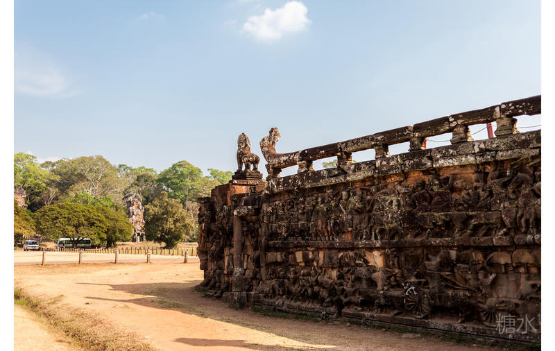 斗象坛,这一纪念碑式的祭坛中央阶梯两侧是饰有三头之象的阶梯和布满大象及主人狩猎场景的巨型浅浮雕的护墙。狮头怪物张开的双臂仿佛正将中央阶梯托起。 长达300米的坛上原本耸立着带有金色框窗户的木制亭子。这里曾经是公共庆典和阅兵的巨大简阅台。