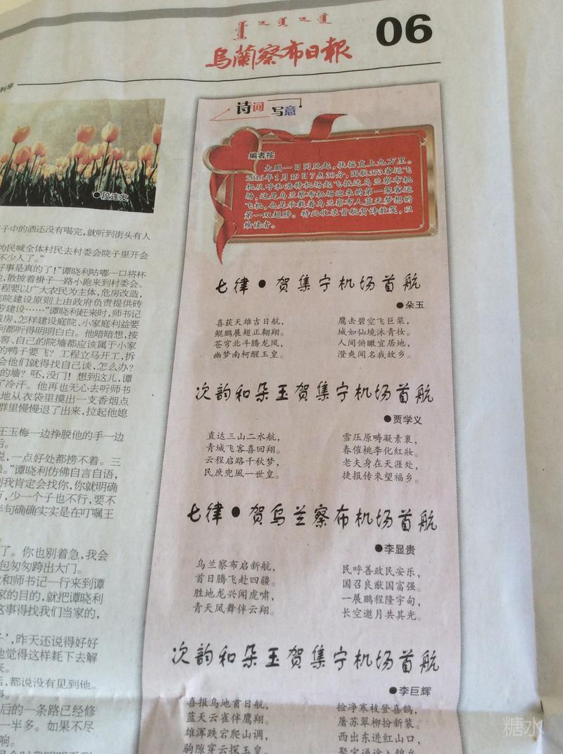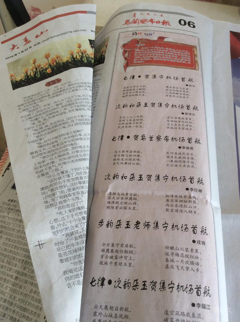 大鹏一日同风起,扶摇直上九万里。2016年1月19日7点30分,国航373客运飞机从呼和浩特机场起飞抵达乌兰察布机场,这是乌兰察布机场迎来的第一架客运飞机,也是承载着乌兰察布人蓝天梦想的第一双翅膀,乌兰察布诗词学会携手内蒙古各界诗人吟诵50余首同诗同贺!乌兰察布日报2016年1月22日已登载数笺,以后陆续登录。