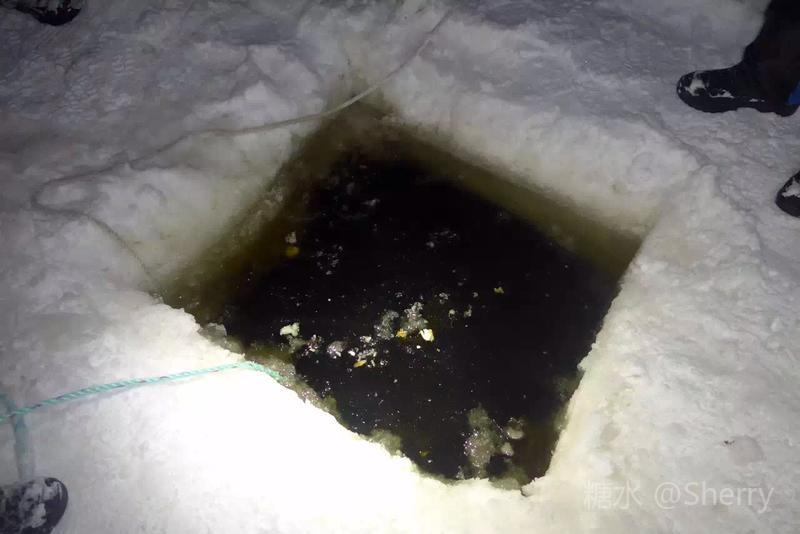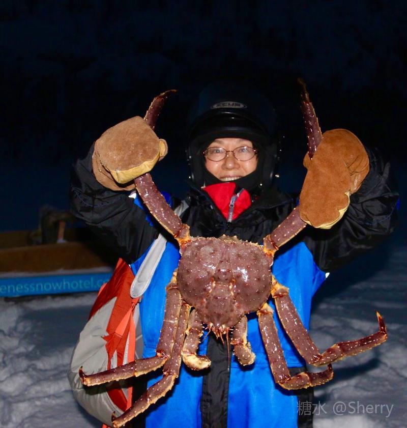 名义上叫钓帝王蟹,实际上是卢克夫妇隔天抑或上午把活的帝王蟹用网兜围起来放进冰湖内“圈养”。