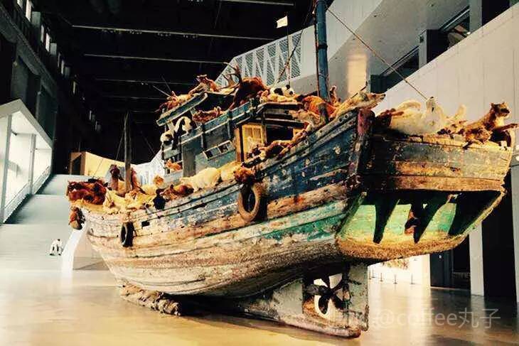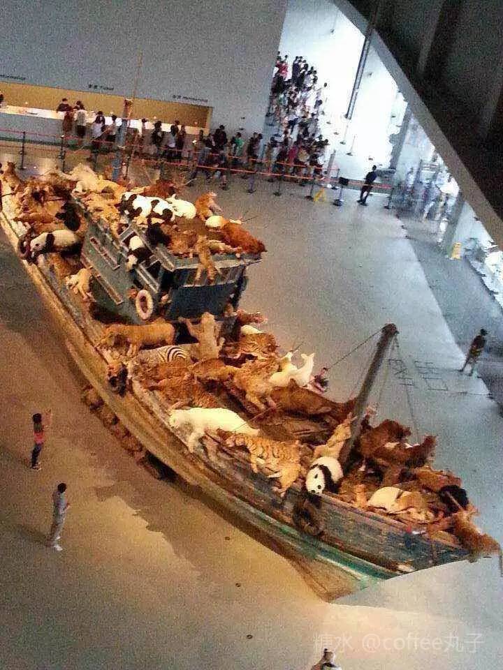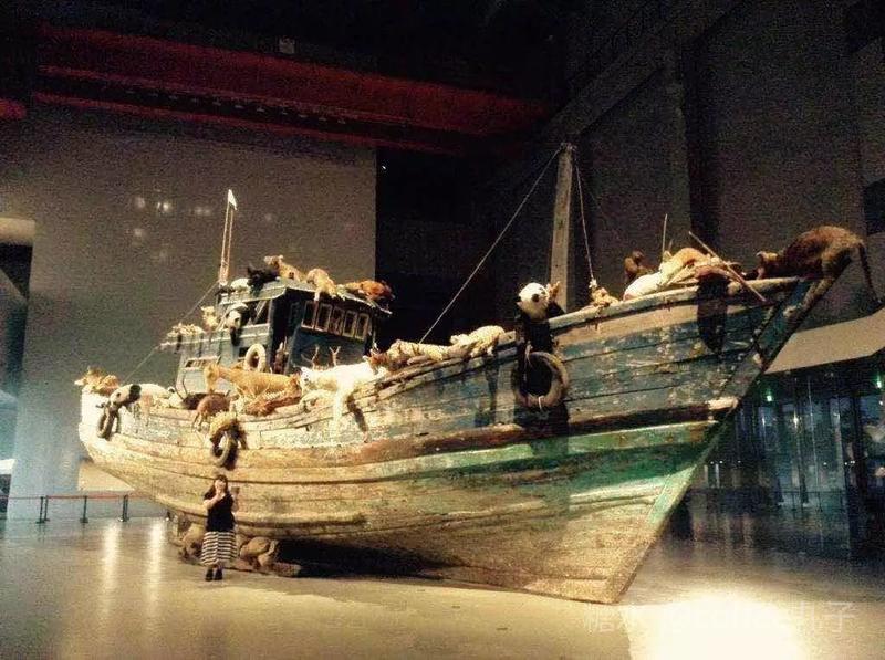 中国艺术家蔡国强的作品巜九级浪》是以生态保护为议题的大型装置艺术作品:一搜满载99只组装动物的福建渔船,从艺术家的故乡缓缓的驶入上海黃浦江外滩。老虎、熊猫、骆驼、猩猩全部齐聚一堂,个个都耷拉着脑袋瘫倒在甲板上,似乎是饱受风浪的摧残。作者希望通过自己的艺术装置让人们更加关注生态及环保事业。