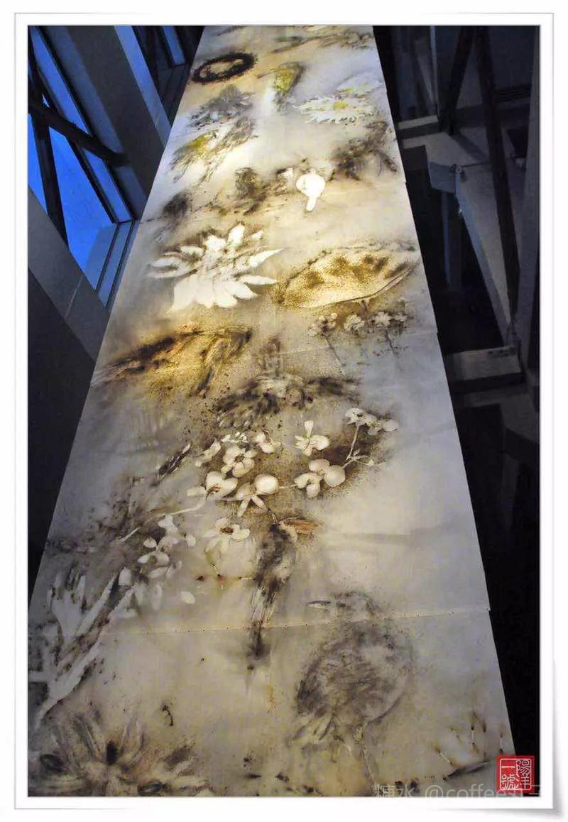 “巴西花鸟图”是作者在巴西动植物专家的指导下,一起摸索丰富多样的南美自然神釆,完成的火药草图制作。高18米、宽4米的火药图立轴贯穿美朮馆天井,在不同的楼层观赏,如同阅读卷轴画,构成当代的视觉体验。
