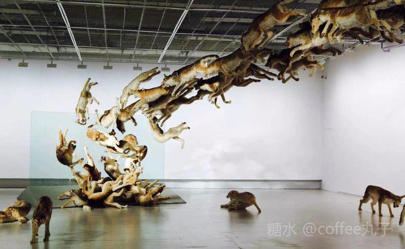 “撞墙”是蔡先生最具有代表性的装置作品之一面,99只狼将自己投入空中,义务反顾的撞到一面透明的玻璃墙上,再滚落折返地面,循环往复。