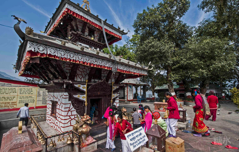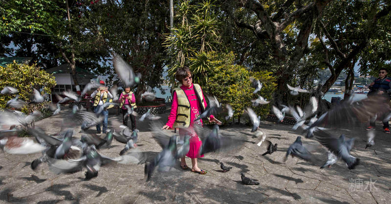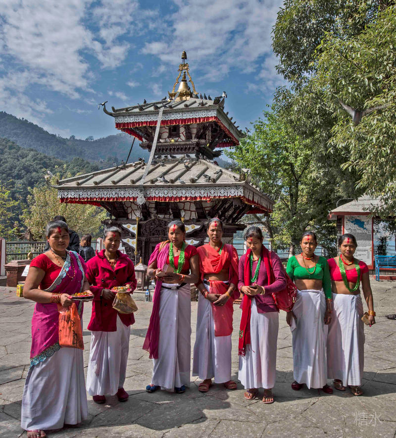 很快来到费瓦湖的湖心岛,小岛绿树环绕,中间一棵三四人合抱的大树,绿荫参天,一座双层飞檐的印度神庙,许多当地青年女子穿着红红的服装结伴而来,脱鞋进入参拜,里面的守庙人为拜庙人祝福,并为每个人的双眉中间点上红色印记。庙前的小场子上,鸽群云集,争食客人抛撒的食物,稍有惊动便轰然而起,十分壮观。