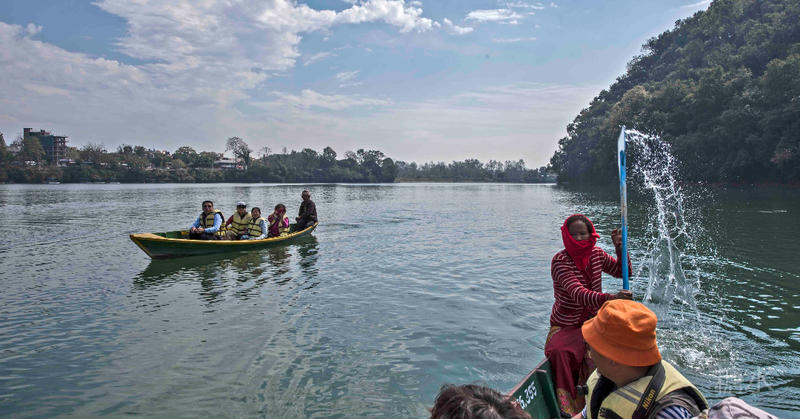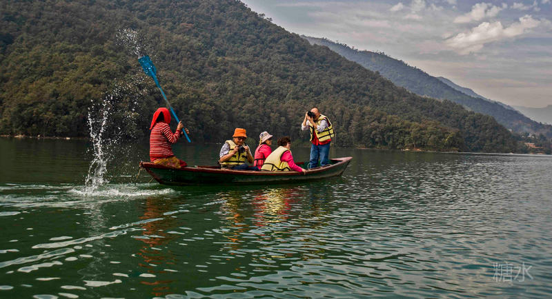 好在有尼泊尔船夫(妇)却为我们上演了抛水划船。他们单浆划船,必须左面划划,再右面划划,让船直驶,在左右转换时把水撩起,甩出一个大水圈,使平静的湖面不断掀起快乐的浪花。