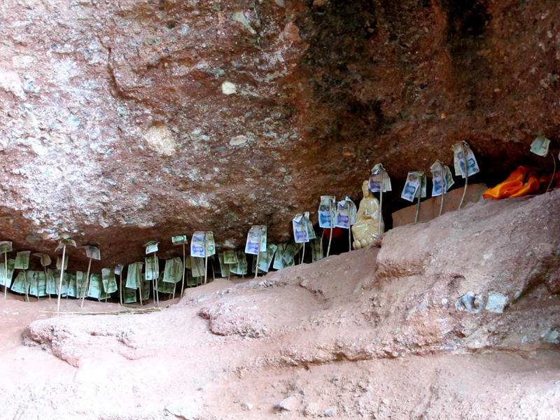 这是人们在祈福,每根小棍上放人民币,据说是为了那些腿脚有病的人。