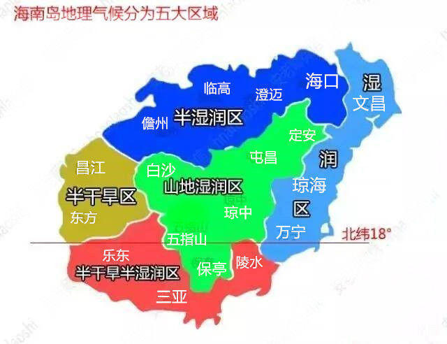 地理学家为了更直观表现这个理论,将海南岛划分为五个区域:湿润区,山地湿润区,半湿润区,半干旱区,半干旱半湿润区。 看官可以根据上面的地理气候图,对照图中所标示的行政区域,分析确认居住地的湿度情况。
