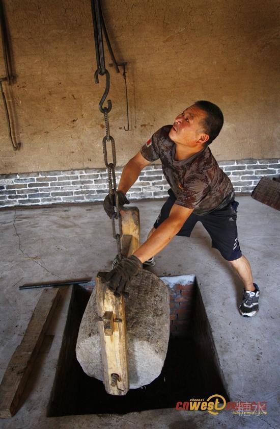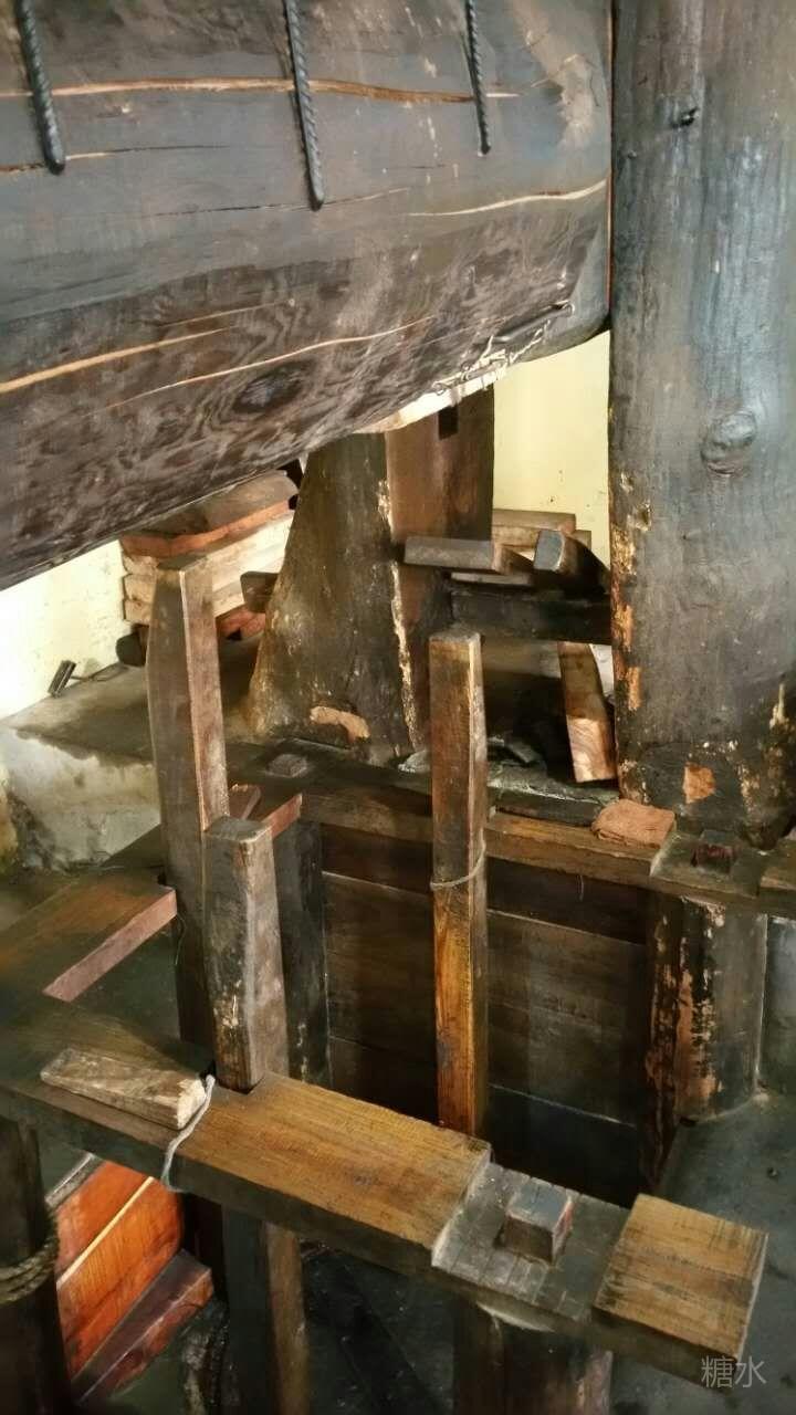 油梁一头吊起,将包好的油坯,料一块一块放入油梁下的榨坑内,垫好,开始落下油梁榨油。 '