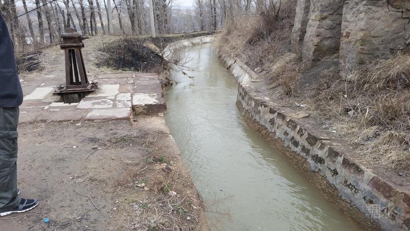 这是横山县当时最大的榨油坊,榨油时油像水一样往虹里流,逐渐流量变小,油坯经过二十四小时压榨,油已榨干,榨油过程结束。当年榨油工人就在这退水闸下的小河里洗澡、取水。,