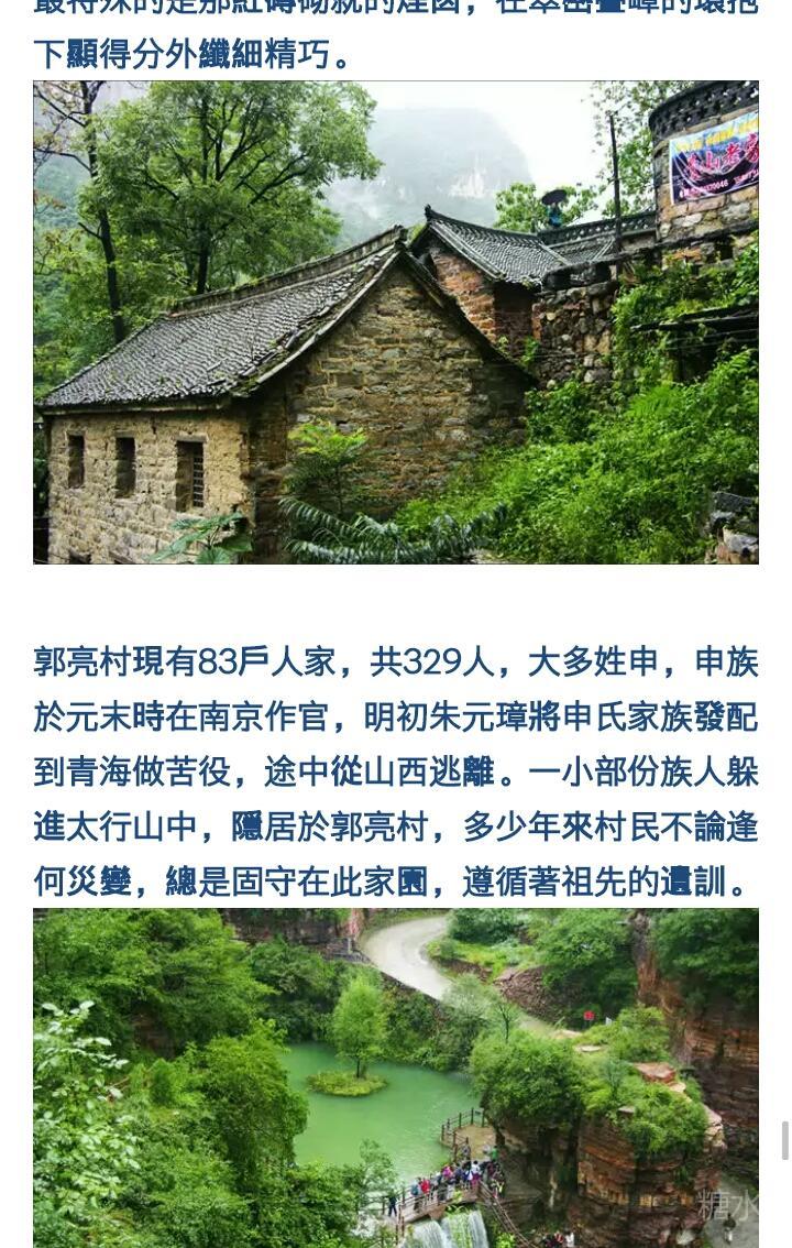 2016-4-28郭亮村隶属于河南省新乡市辉县沙窑乡,位于河南省新乡市辉县市西北60公里的太行深处沙窑乡、与晋城市陵川县古郊乡昆山村交界,海拔1000米,现有83户人家,共329人。 郭亮村依山势坐落在千仞壁立的山崖上,地势险绝,景色优美,以奇绝水景和绝壁峡谷的“挂壁公路”闻名于世,又被誉为“太行明珠”。