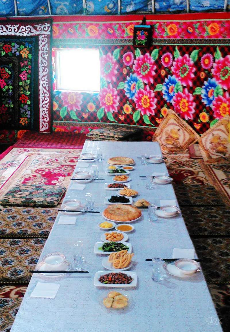 在新疆伊犁的饮食很有浓郁的民族风味,特别是在胡杨林下的哈萨克族毡房中进餐,更是别具一格。