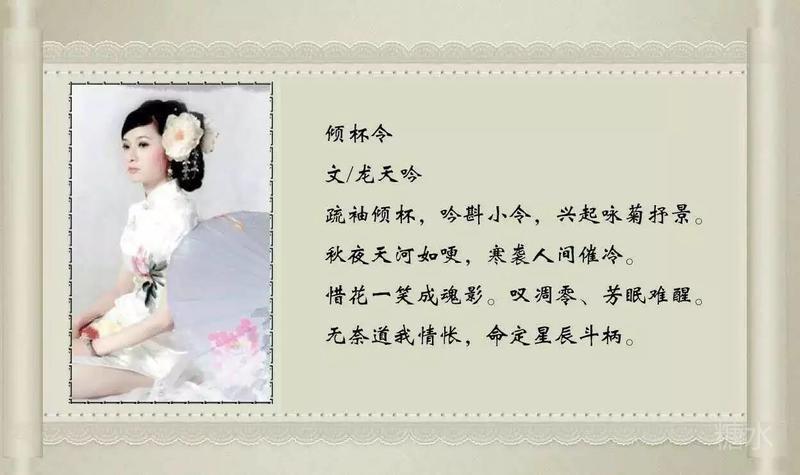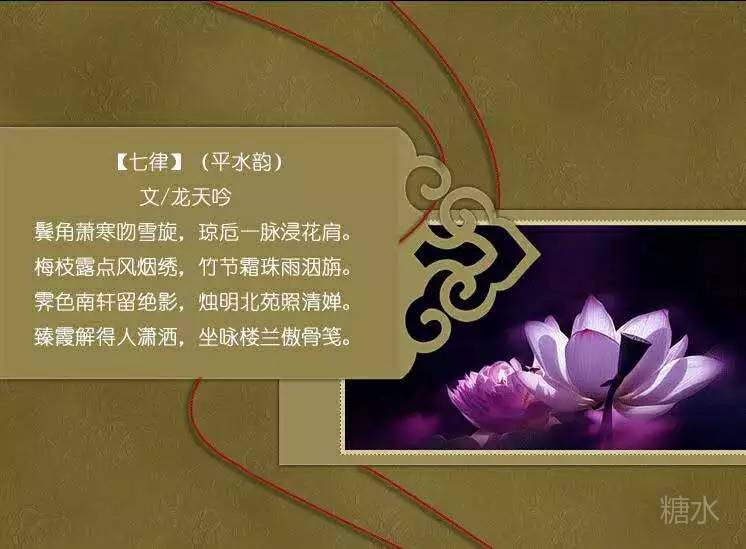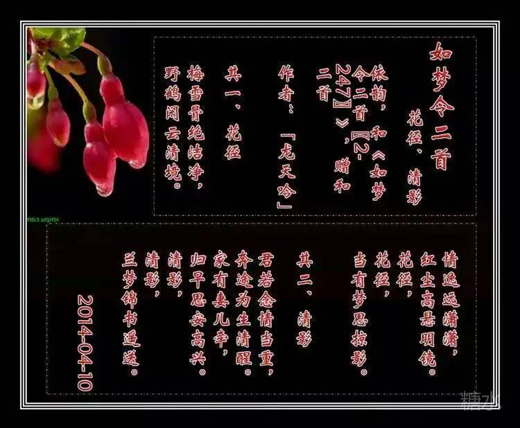 十四行诗 /虚无与情感 文/龙天吟 携着真心水墨相邀 笔落这淡雅的五月 靓词曳影 举盏美好向青鸟 大千里吾之径 日月沉浮天地动静眸中说… 一花醉晕柳堆烟 那些春风徐徐穿过生命的邂逅 灵山火焰喷涌 烹诗胸伟岸 骚人让风花落案,墨客绽放雪月时候… 花之舞,舞在春日秋光里 风之越,越递钟磬山寺外 月之悬,一夜暮鼓敲下雨烟打湿泥 雪之来,可是你飘逸长袂山河白… 看,那千年绝妙冰清的神女在这季节里左盼右顾 魏紫姚黄不是也向红尘撑开勾魂的时光媚目…