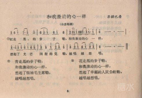 二、《金彦玛》的演奏者以及《赞歌》的诞生 那时候,民族歌舞团办公条件十分简陋。苏赫巴鲁临时在团长办公室工作,还有一张掉了漆的破桌子。苏玛任副团长,连个桌子都没苏玛生活简朴,为人敦厚诚恳。他有一套高级毛料西装,一双黑色的尖头皮鞋。这套行装,是苏玛去欧洲演出前用国家专项专款订制的。他还有一件灰黑色的雨披,也是外国货。歌舞团的年轻人,都很羡慕这些东西。平时他舍不得穿,只有在出国和正式演出时,才肯穿上这套毛料西装。 苏赫巴鲁是苏玛的学生,那时,他还不会吸烟。苏玛有个长10mm宽8mm左右的铁盒子,盒里装着带香料的黄烟。苏赫巴鲁每每记完曲谱,苏玛总要给他卷上一根烟,让他抽,他总是婉言谢绝老师的好意。苏赫巴鲁说:“直到现在,我还时常想起苏玛先生拉琴的姿势。他拉琴的时候,总是处在沉醉之中,闭着眼睛拉琴,琴曲总在景物里。他平时总戴着一副平面眼镜,其实他眼睛没毛病,戴眼镜只是一种习惯。苏玛是个方脸,身材清瘦,中等个,鼻子又平又直,眼睛较大,体形很匀称。他的十指极其修长,手相带着十足的贵族气。每当他穿上那套蓝料子西装时,我们总要说上几句赞美的话。” 1961年,苏赫巴鲁写了一首歌词,题为《和我激动的心一样》。恰在此时,吉林省群众艺术馆、吉林人民出版社要出版《吉林小调集》。于是,苏赫巴鲁把这首歌词填在苏玛演奏的郭尔罗斯民歌《金彦玛》(三)上,并在此基确上增添了些许的装饰音。还有一首词叫《一块云怎会下大雨》,填在《东克尔大喇嘛》的曲调上,寄给群艺馆的老师,1963年10月《吉林小调集》由吉林人民出版社正式出版。 例如下图:1963年,苏赫巴鲁发表在《吉林小调集》中的歌曲《和我激动的心一样》原件