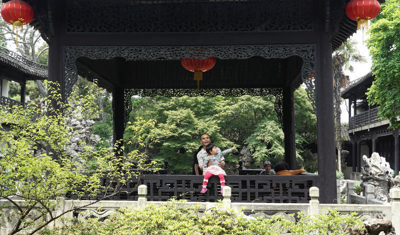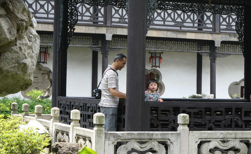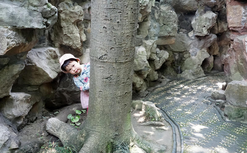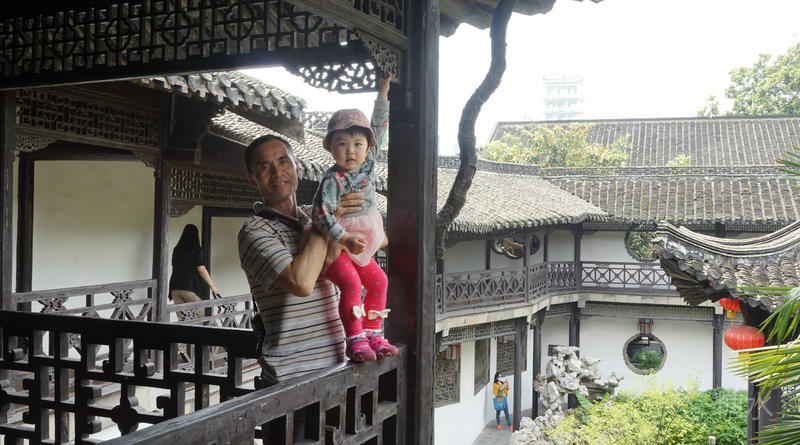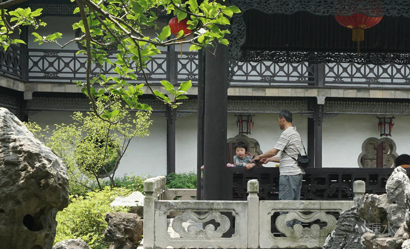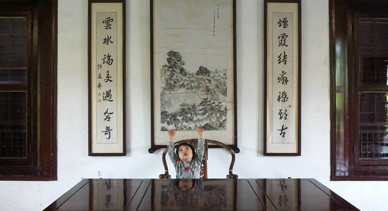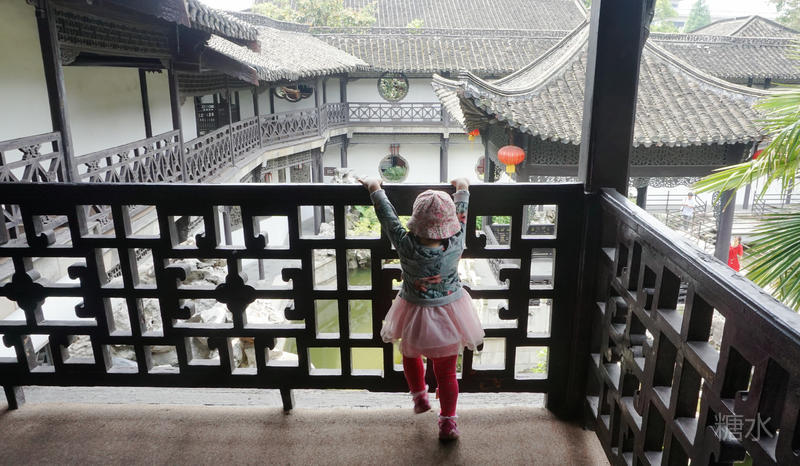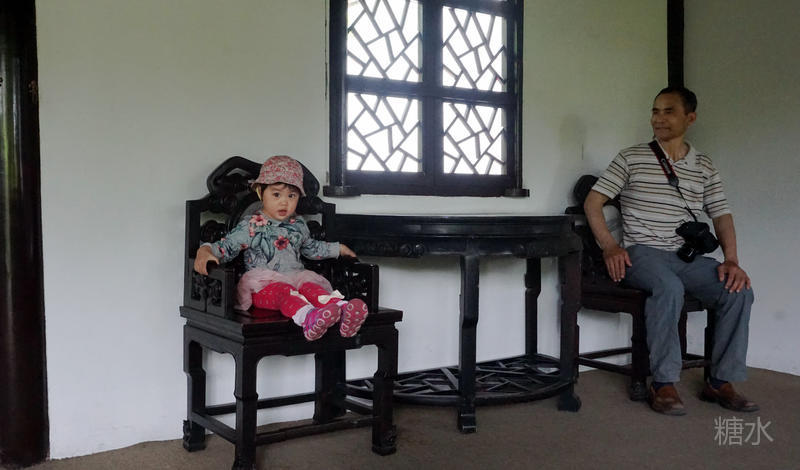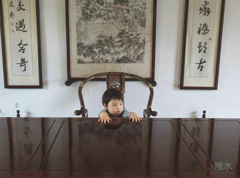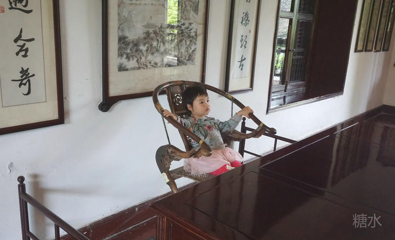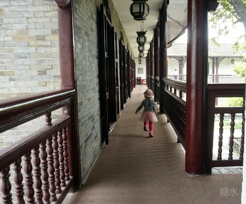 萌娃身后这个带回廊的飞檐厅堂,长长的飞檐形似一艘船,此厅四壁开窗,镶嵌玻璃的花窗很通透,坐在屋中就可观赏四周花园。 门口抱柱上有木刻对联“月作主人梅作客,花为四壁船为家”,所以名曰“船厅”。