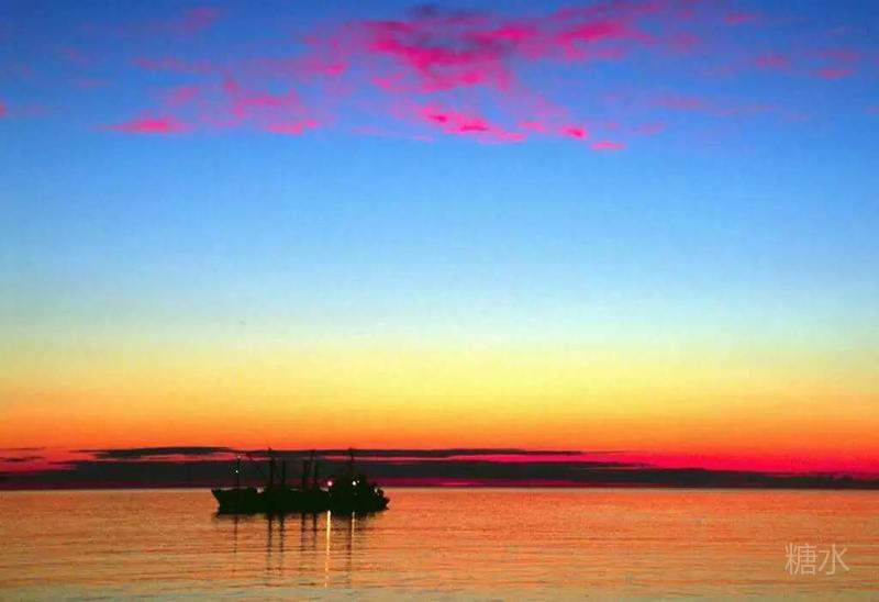 东滩海水绿如兰, 西坠残阳化万端。 五 彩云霞呈暖意, 谁还记忆九霄寒? 6月25日晨