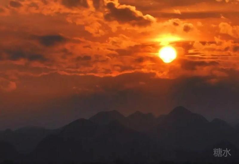 转瞬残阳西墜山, 倾刻赤颜素锦间。 朱砂浆滾云离陆, 疑幻春秋烽火烟。 2016年6月24日夜