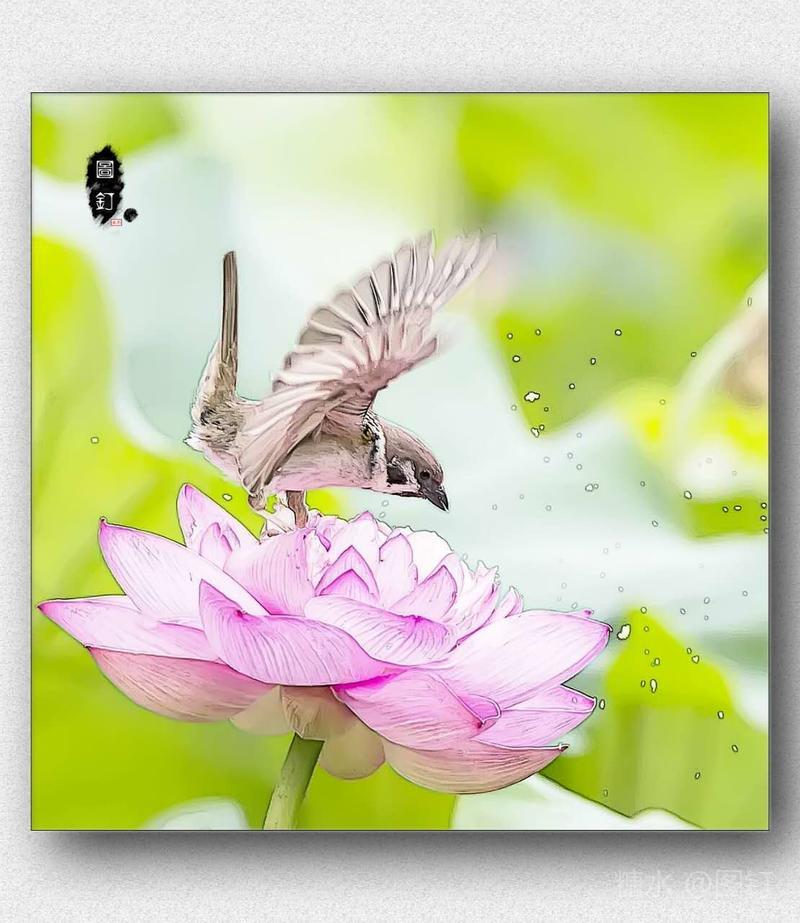 齐云山人留言: 前有蜻蜓戏, 后有翠鸟戏, 今又有麻雀戏, 以一戏字贯之, 用一荷字承之, 挥虫鸟雀悅之, 这是生命之河里一曲悠扬的长歌! 生命,生生不息! 艺术,日日维新! 大赞!