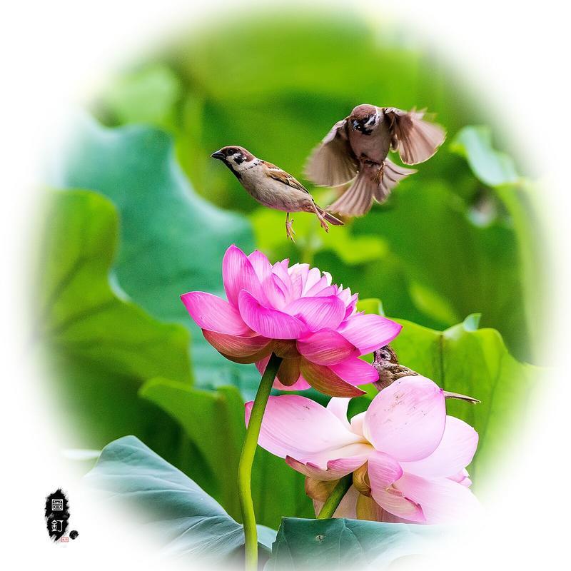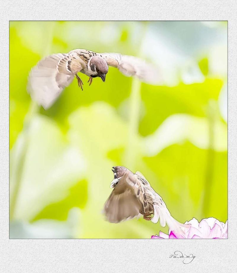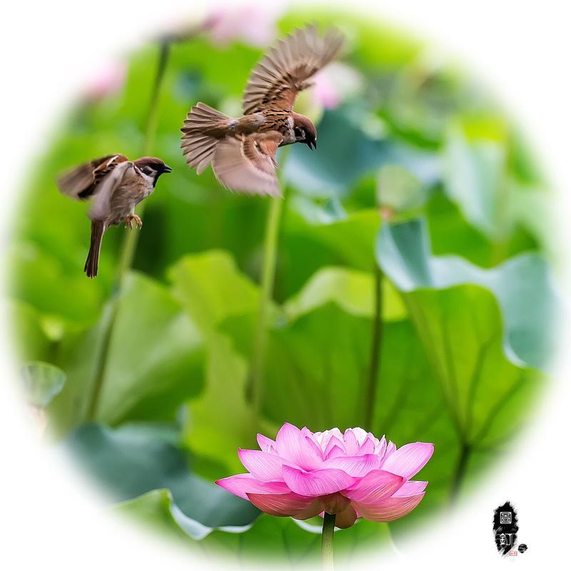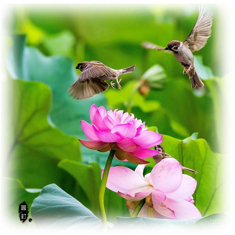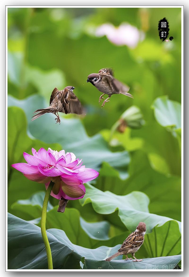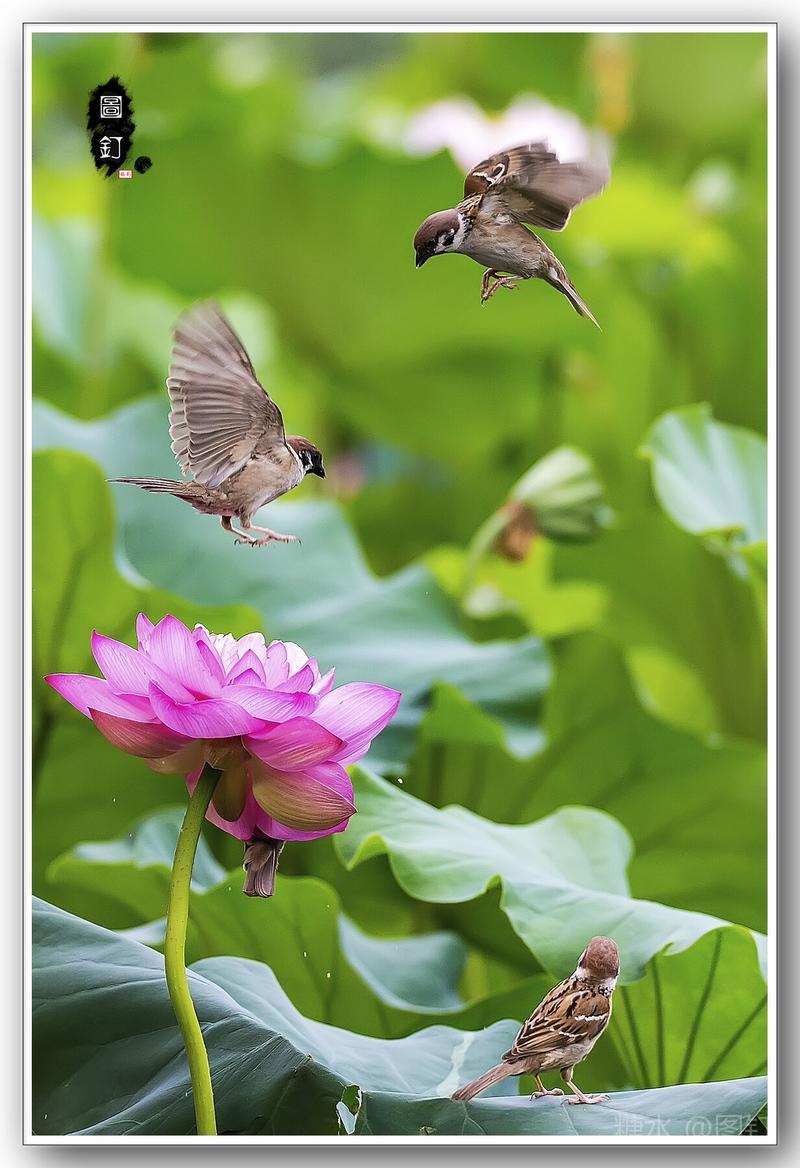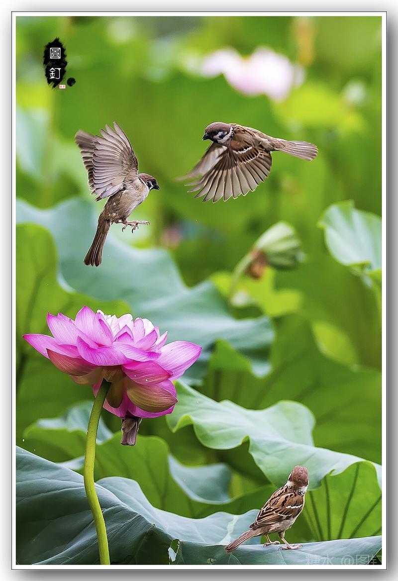 心灵手巧留言: 拍荷容易,戏莲难,成双成对鸟儿戏莲更难拍,鸟儿的情,鸟儿的爱,飞舞在荷上,极美!