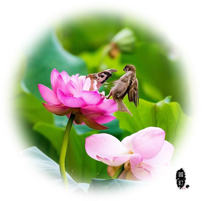 奇建平留言: 一枝莲花独秀,二只麻雀戏舞。绝!