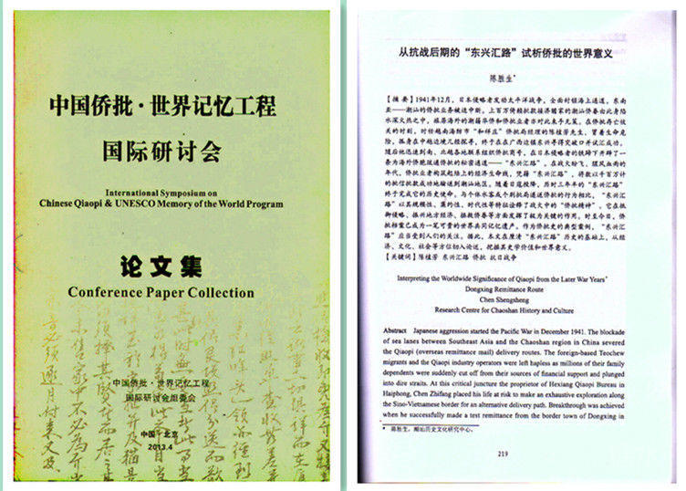 陈胜生论文:《从抗战后期的"东兴汇路"试析侨批的世界意义》,收编入《中国侨批 · 世界记忆工程国际研讨会论文集》。