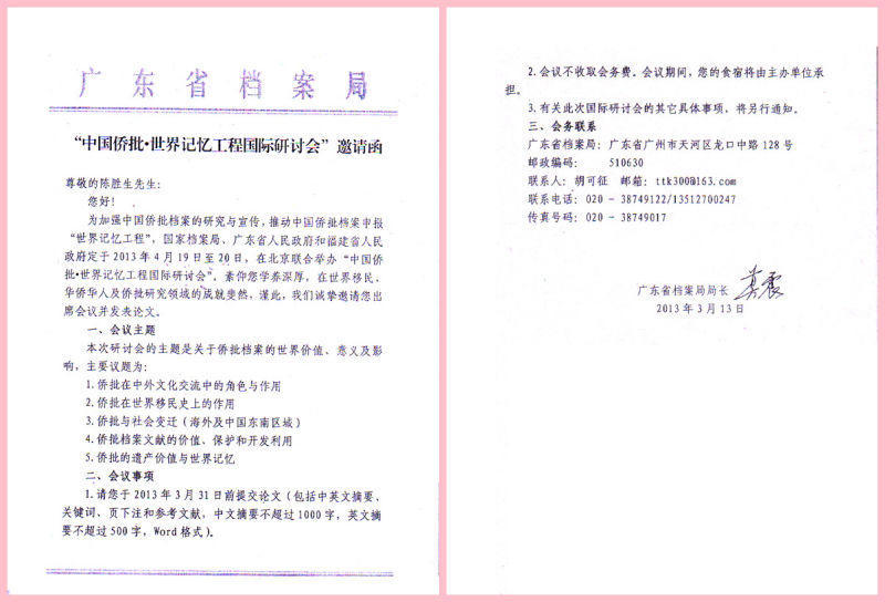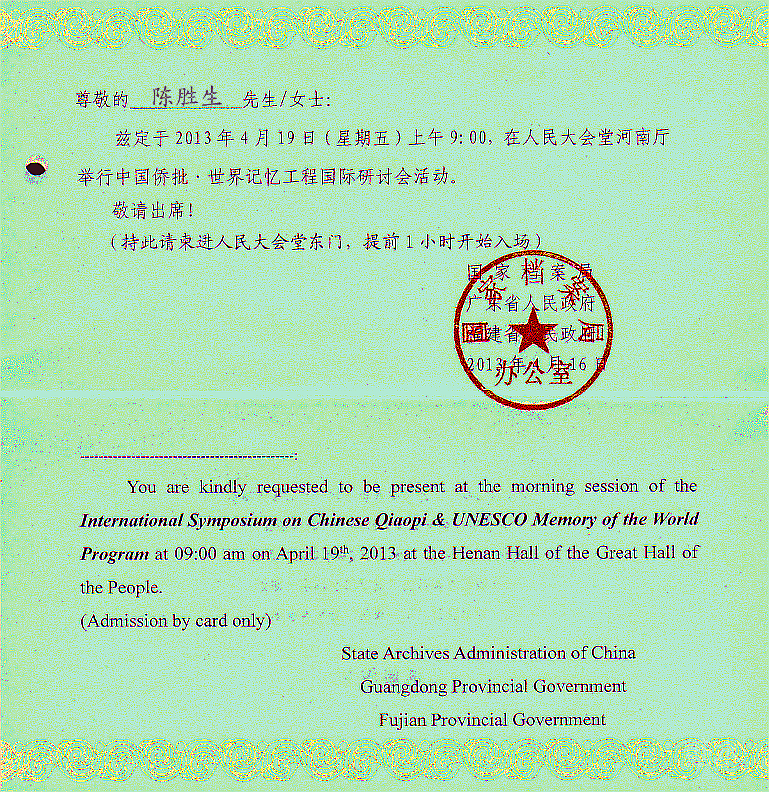 国家档案局向海内外侨批研究专家发出的《中国侨批 · 世界记忆工程研讨会》请柬中英文本。