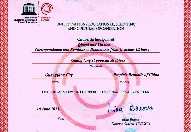 "中国侨批"入选《世界记忆遗产名录》证书。 十年磨一剑。广东省汕头市潮汕历史文化研究中心,无愧为侨批研究领域中的领头羊,组建了一支由海内外各阶层人士组成的高素质侨批文化研究团队,为"中国侨批"研究获得丰硕的成果,为侨批"申遗"作出巨大贡献。2013 年6月19日,"中国侨批"入选《世界记忆遗产名录》。